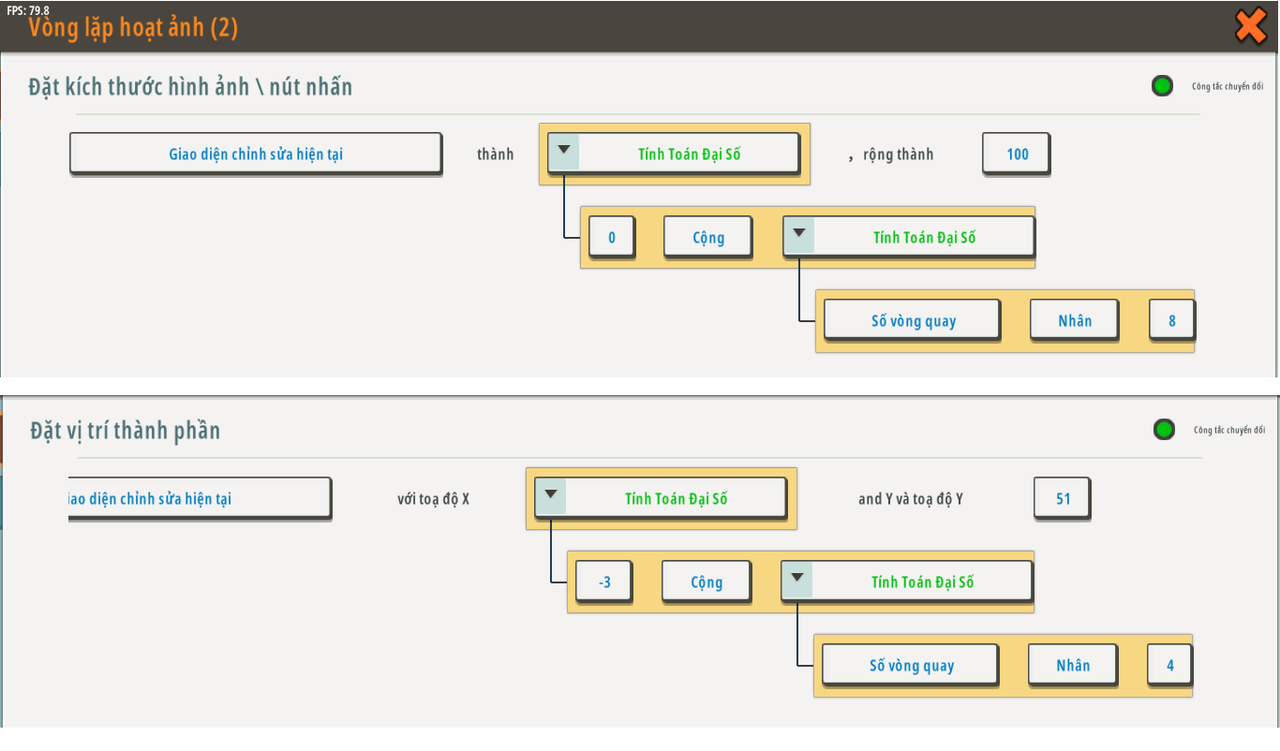 Sau đó sửa đổi độ dài của thẻ trong “Vòng lặp hoạt hình 2” thành: 0 + thời gian vòng lặp x 15. Tọa độ x là: 75 - thời gian vòng lặp x 7,5.