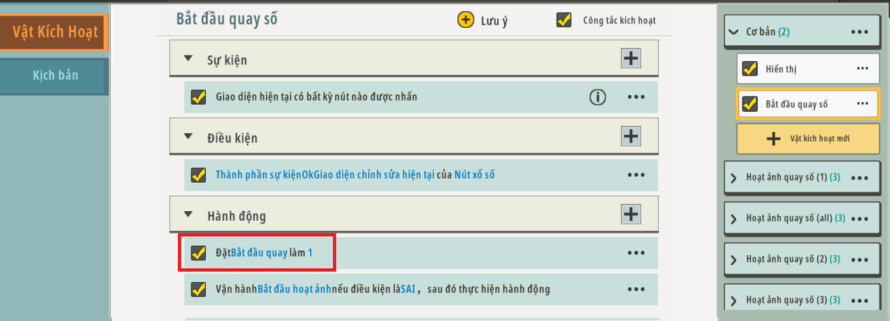 Trước tiên, hãy đặt trình kích hoạt mới có tên là “Bắt đầu hoạt hình” để chạy khi người chơi nhấp vào “Nút xổ số”, sau đó đặt hành động kích hoạt là: chạy “Bắt đầu hoạt hình”.