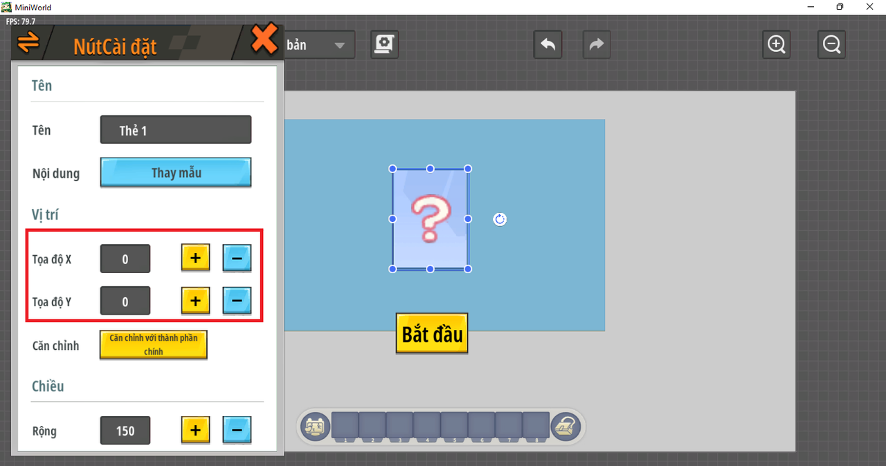 Mục đích của việc này là di chuyển vị trí của thành phần này để đạt được hiệu ứng lật và tọa độ của (0,0) sẽ thuận tiện hơn khi đặt. Tiếp theo, để thực hiện thao tác lật bài, bạn cũng có thể tạo một thành phần phụ hình ảnh khác tương tự như dấu chấm hỏi trên thành phần này, tuy nhiên bạn cần nhớ chiều dài, chiều rộng và tọa độ của thành phần đó: