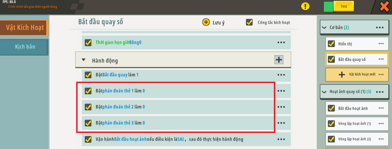 Sau đó, thêm hành động mới vào trình kích hoạt “bắt đầu hoạt ảnh” của mỗi thẻ: gán biến “phán đoán thẻ” tương ứng cho 1.