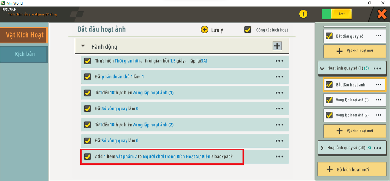 Sau khi thiết lập thay đổi lật thẻ, hãy thêm hành động “Thêm vật phẩm” vào cuối cùng một trình kích hoạt để đưa ra loại vật phẩm tương ứng cho ba lô của người chơi.