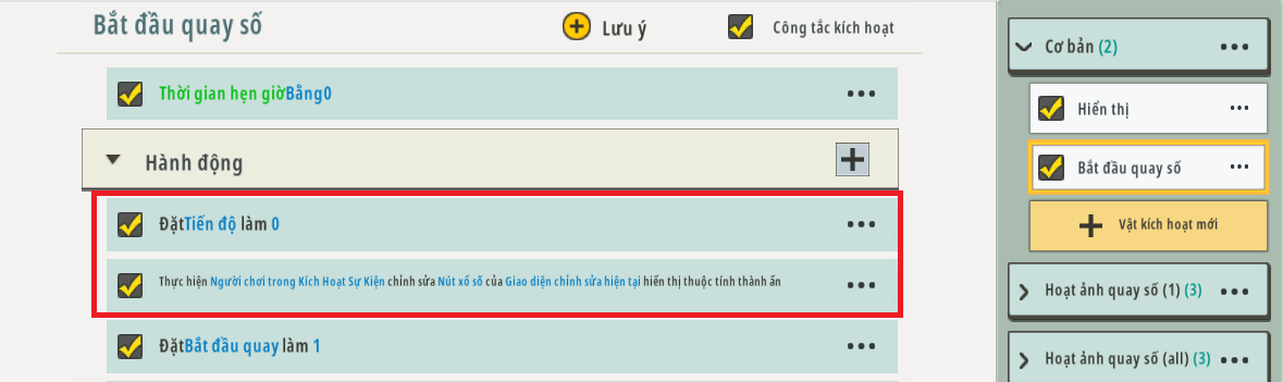 Sau đó đặt điều kiện của trình kích hoạt “Nút hiển thị 2” thành “tiến trình xổ sốBằng 3” và hành động “hiển thị nút xổ số”.