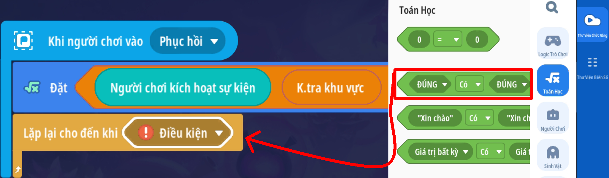 1. Tạo trigger người chơi vào khu vực "Phục hồi" sẽ đặt giá trị "K.tra khu vực" thành giá trị: ĐÚNG