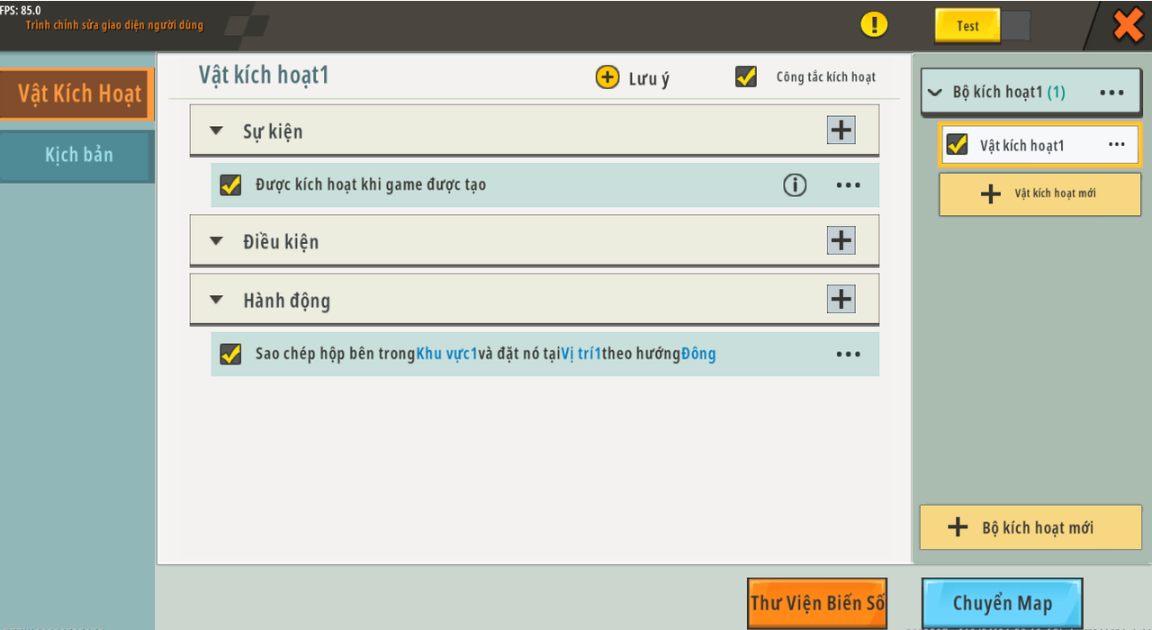 Tên trình kích hoạt: Trình kích hoạt1 Sự kiện: Được kích hoạt khi trò chơi được tạo Tình trạng: không áp dụng Hoạt động: Sao chép tất cả các khối trong [Vùng1] , đặt vào [Vị trí1] và hướng [Đông]