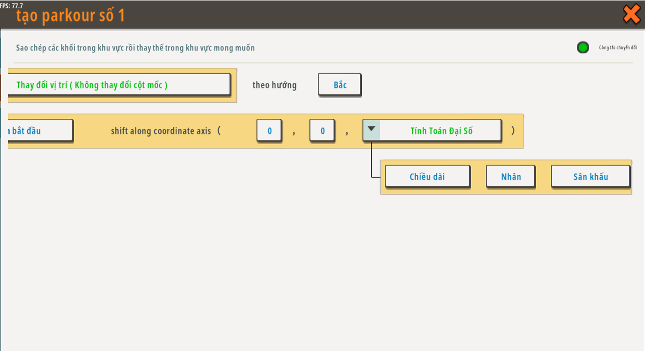 | Biến toàn cục | tạo parkour mới | Khu vực | Không có giá trị mặc định | N/A |
