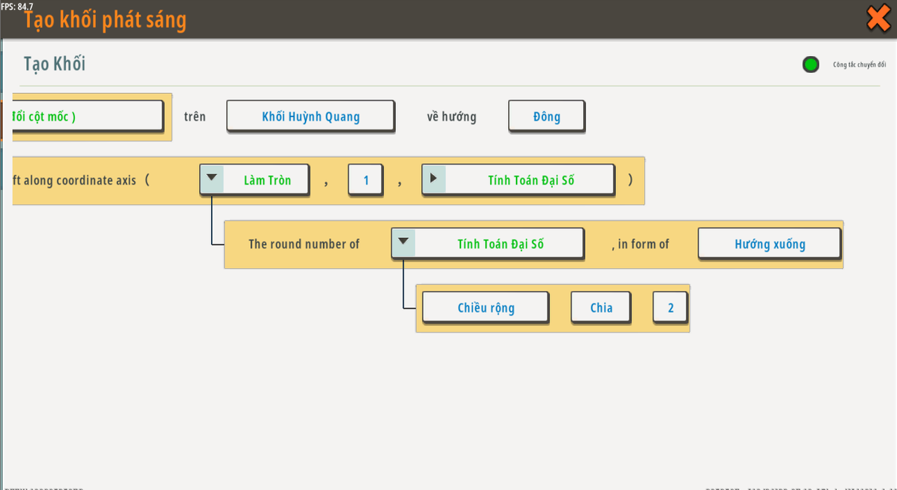 Tạo [Khối sáng bóng] trên [ Bù vị trí (Vị trí ban đầu đã cố định) {《điểm bắt đầu》 dịch chuyển dọc theo trục tọa độ ( 《[Vòng {Số vòng của /Hoạt động số <chiều rộng của giai đoạn> <Chia> <2>/ , trong dạng /Downward/ } ] 》 , 《1》 , 《Phép toán số [ / {độ dài của giai đoạn} {Nhân} {giai đoạn} ] / {Giảm} {1} 》 ]