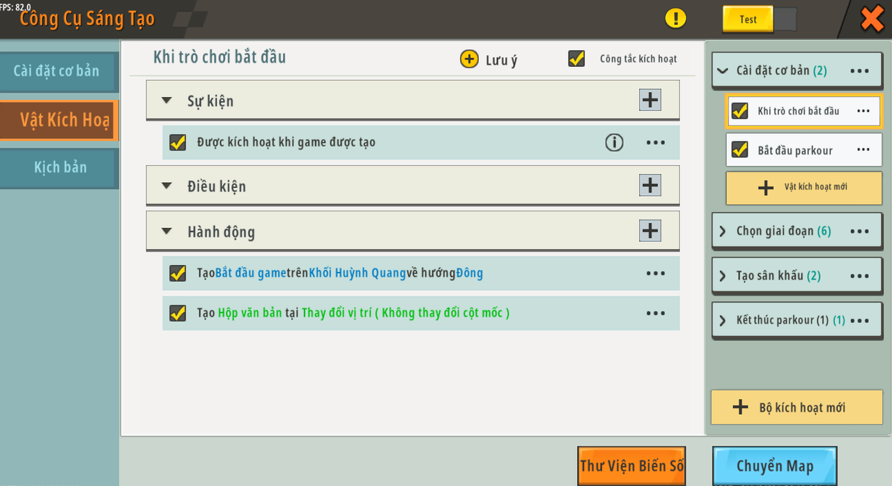 Tên trigger: Bắt đầu parkour Sự kiện: Bất kỳ người chơi nào chạm vào khối Tình trạng: [Loại khối trong sự kiện] [Có] [Khối tinh thể huỳnh quang] Hoạt động: Phá hủy khối trên [Vị trí sự kiện] Xóa [Hộp văn bản] có ID là [1] trên [Bù vị trí (Vị trí ban đầu đã cố định) ''<game start> dịch chuyển dọc theo trục tọa độ <0> , <1> , <0>'' ] Phát [Hiệu ứng ánh sáng32] trên [Vị trí sự kiện], kích thước là [1] Chạy [Chọn ngẫu nhiên] , kiểm tra xem điều kiện có đúng không, sau đó chạy hành động