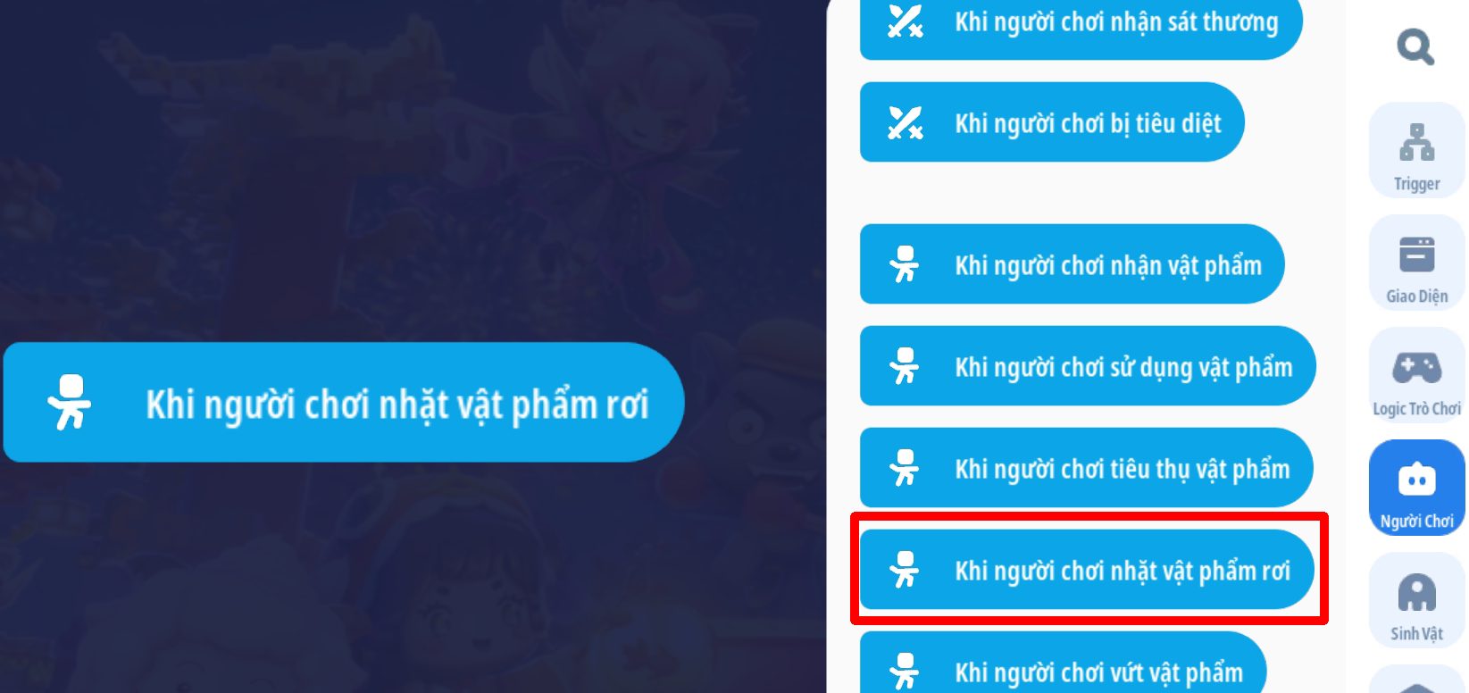 - Bước 6: Thêm các hành động kích hoạt mã tự chế, ví dụ cơ chế nhiệm vụ người chơi nhặt vật phẩm “trứng kì lân thần thoại ”