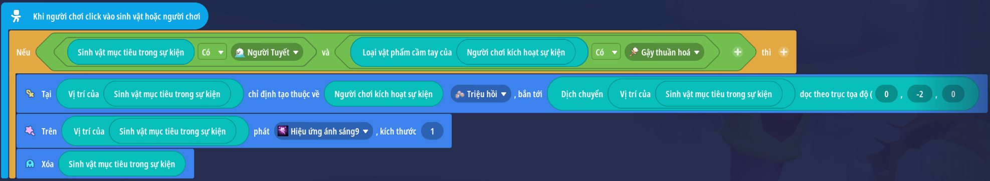 - Tạo sự kiện với 2 điều kiện vật phẩm cần tay là vật phẩm chỉ định và sinh vật mục tiêu là sinh vật cần thuần hoá