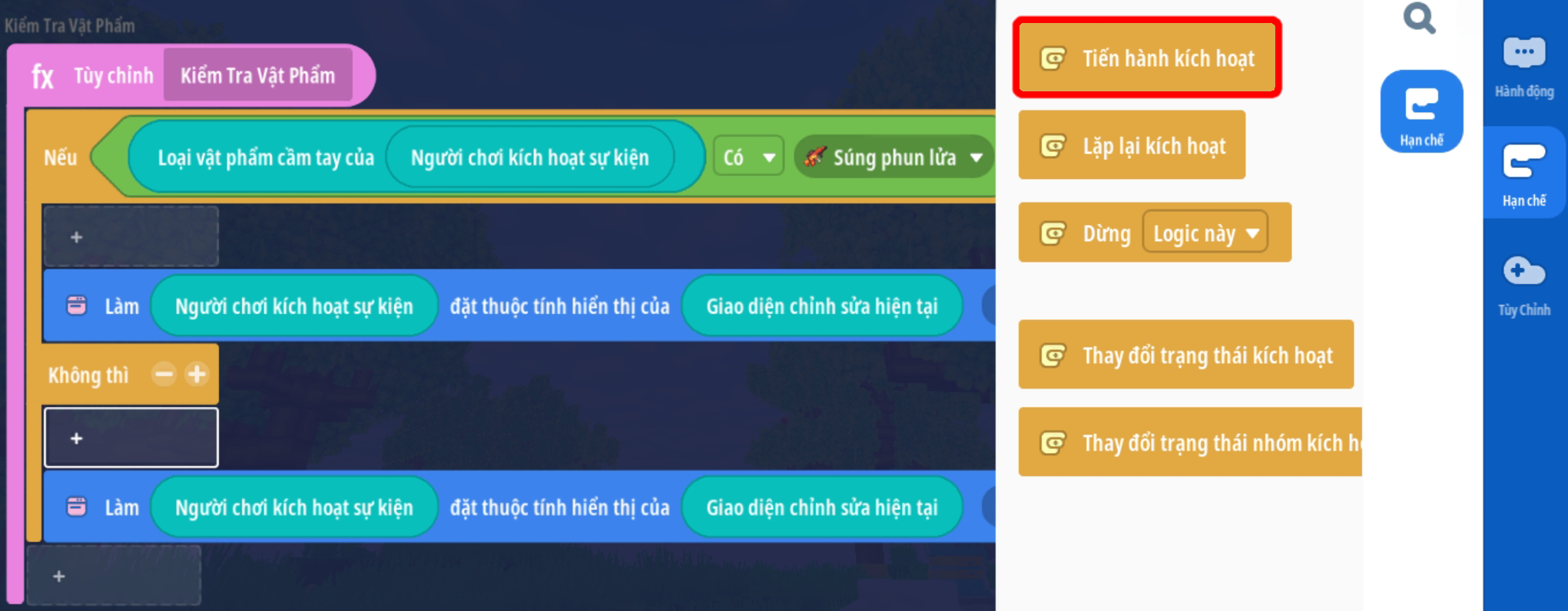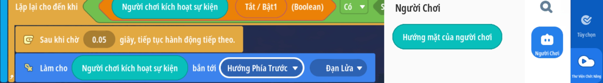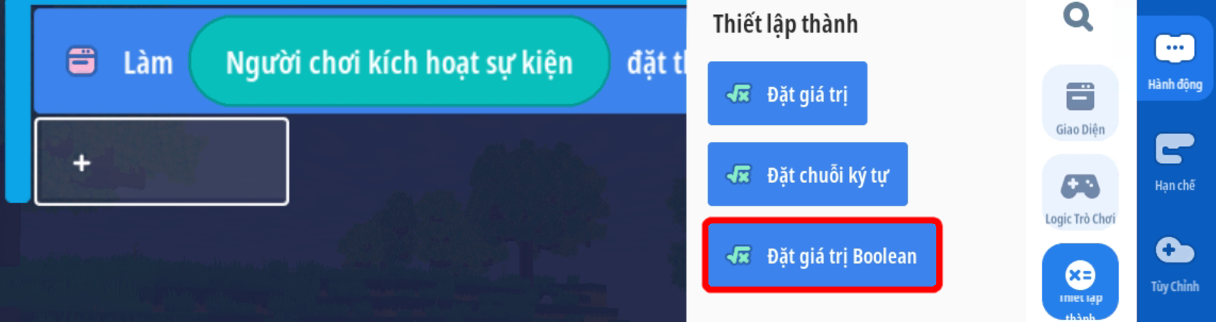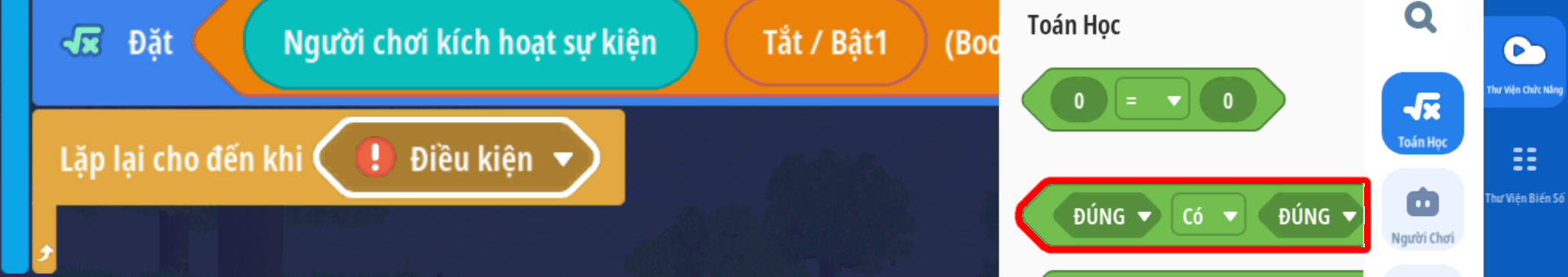 - Hiện thành phần nút tắt ( thêm chức năng ẩn thành phần bật nếu cần thiết ), đặt giá trị Boolean xác định người chơi đang bật chức năng