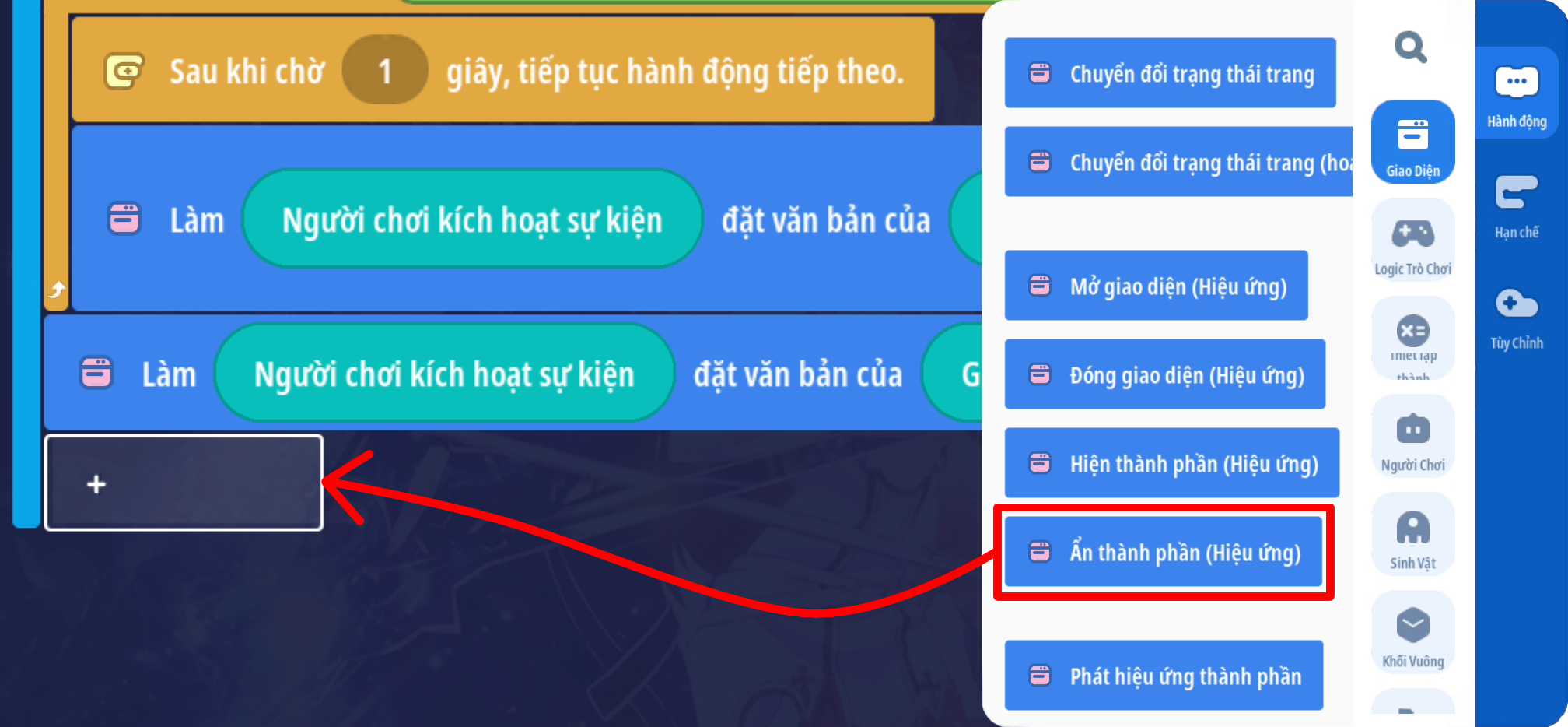 - Bước 10: Thêm 'Ẩn thành phần' trong hành động, hiệu ứng có thể có hoặc không. Thiết lập ẩn thành phần UI văn bản “Thời gian”