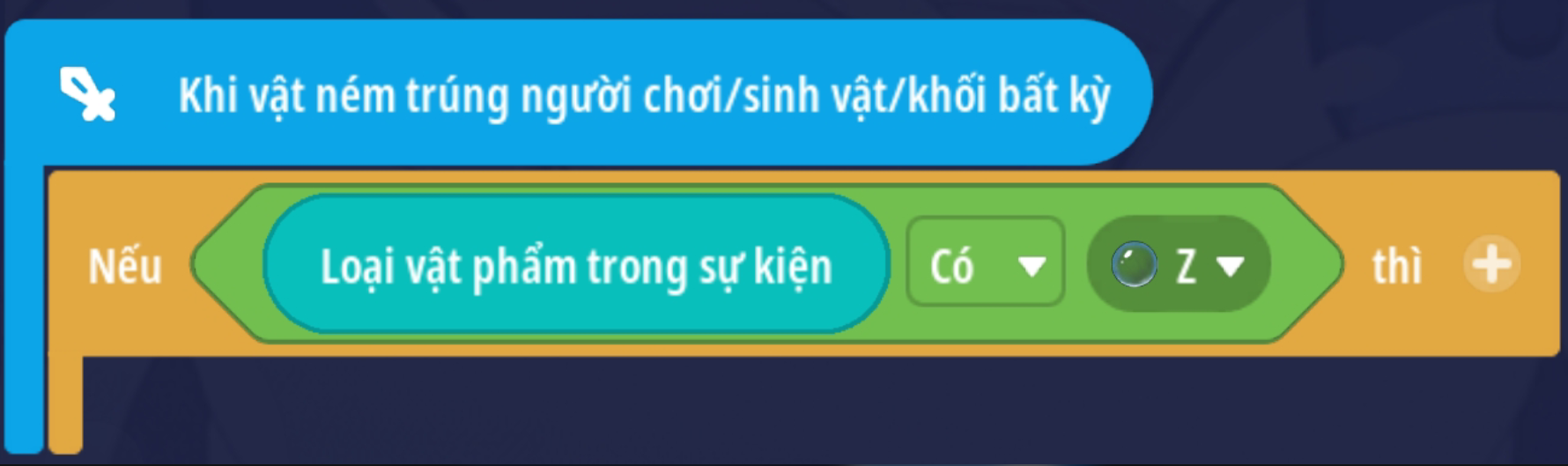 - Bước 5: Thiết lập điều kiện loại vật phẩm trong sự kiện là plugin vật ném đã tạo