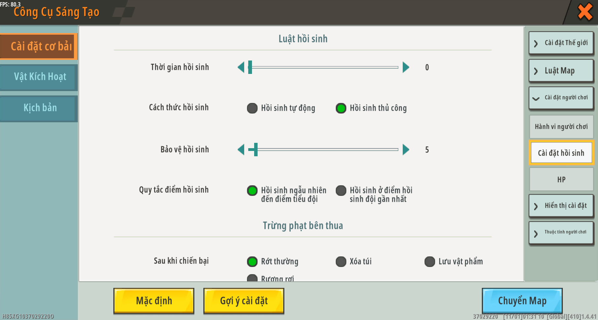Bạn có thể đặt hành vi và quyền của người chơi trong cài đặt người chơi, bao gồm hành vi của người chơi, cài đặt hồi sinh và mạng sống.