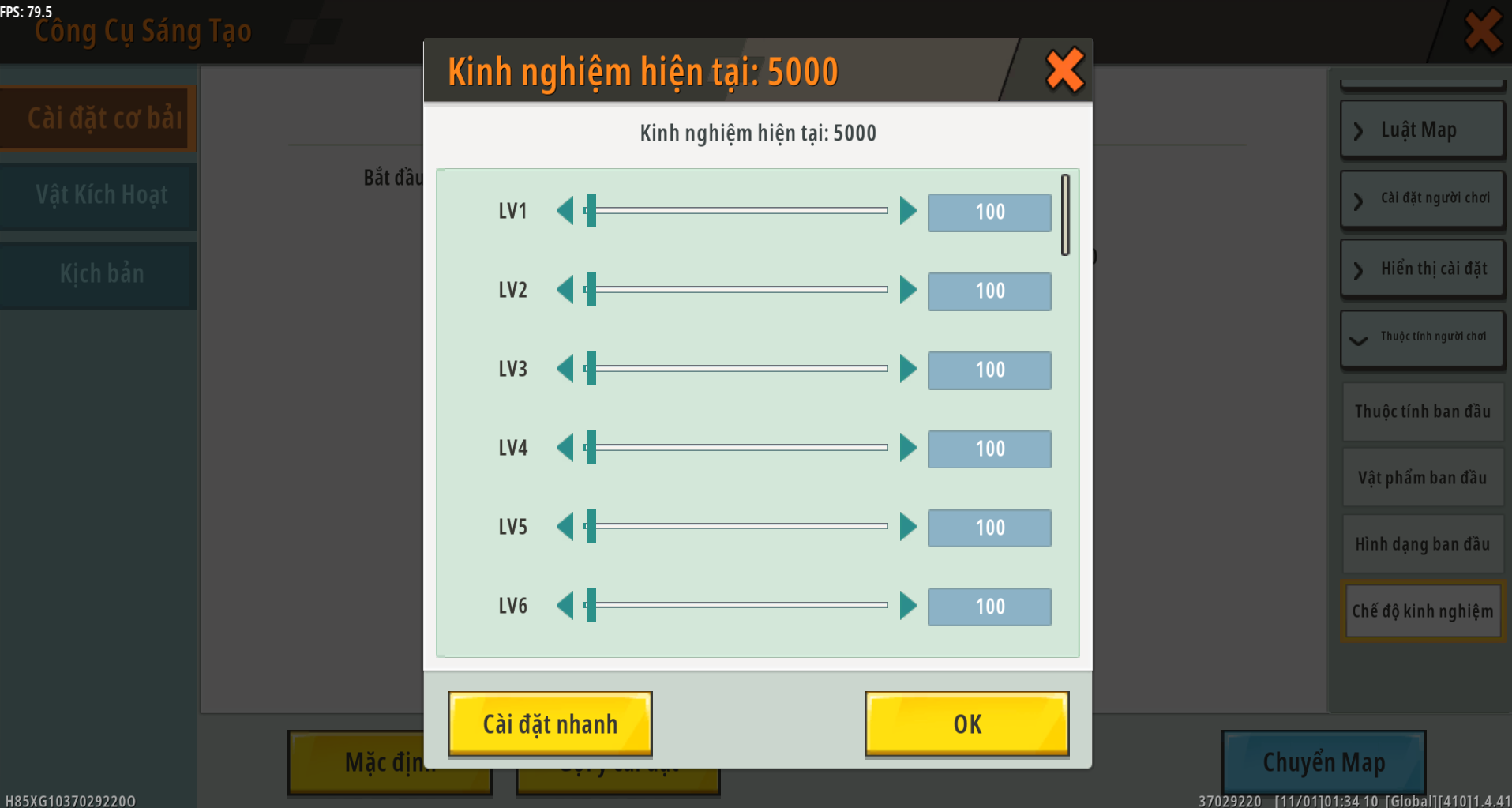- Nhạc nền (thế giới tăng tốc, linh hồn lạ, phong cách Trung Hoa, trận chiến, thần cô đơn, không khí giải mã, bom, sân bóng, không có nhạc): Chọn nhạc tương ứng theo chủ đề bản đồ của riêng bạn.
