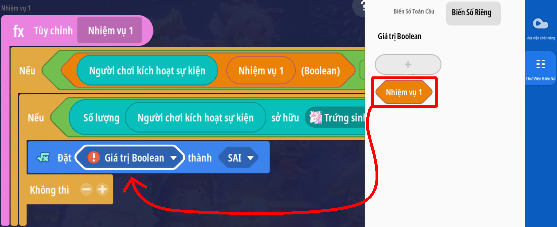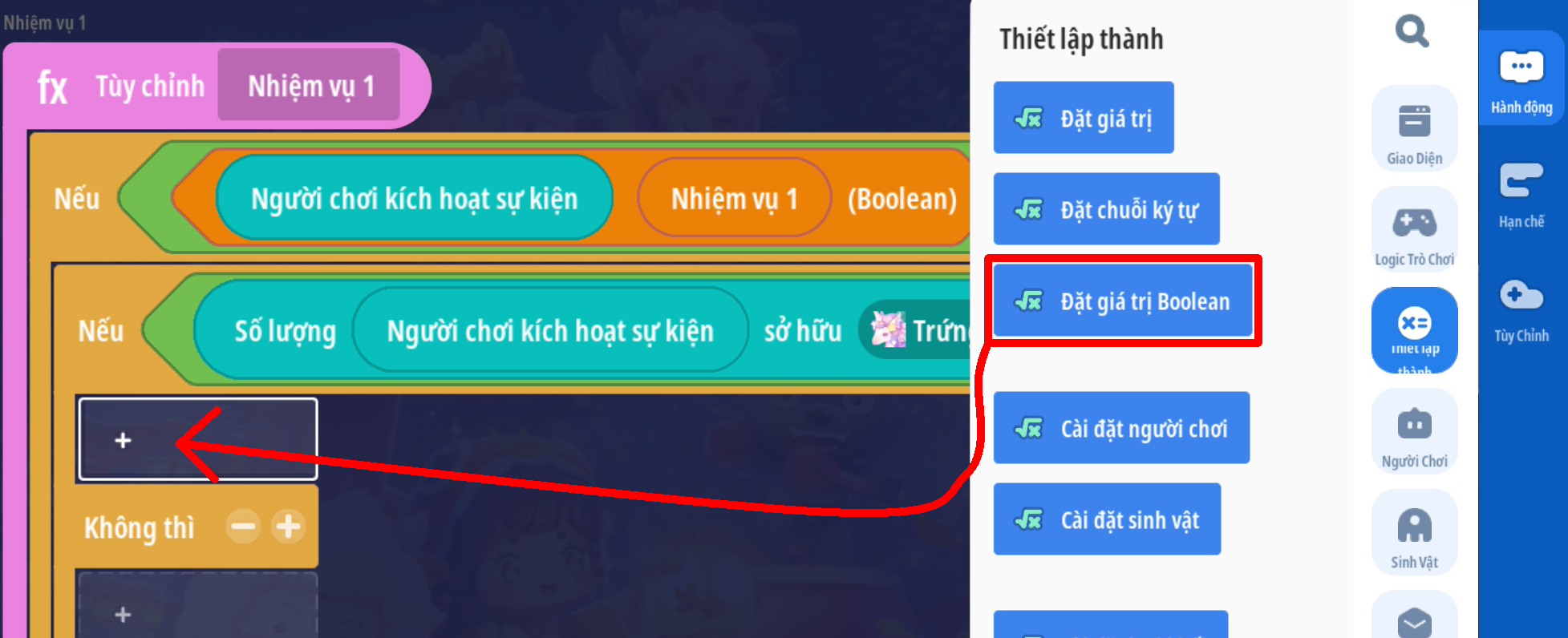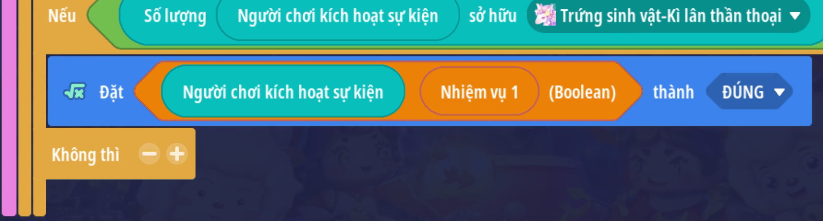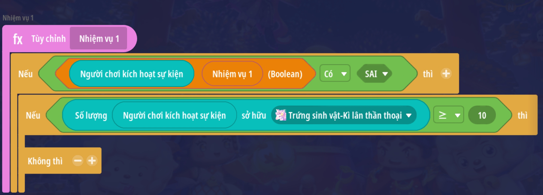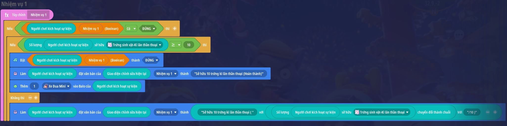 Lưu ý: với các bản đồ có cơ chế lưu tiến trình nên có thêm trigger cập nhật thông tin nhiệm vụ khi người chơi đăng nhập vào trò chơi. Tham khảo mẫu dưới