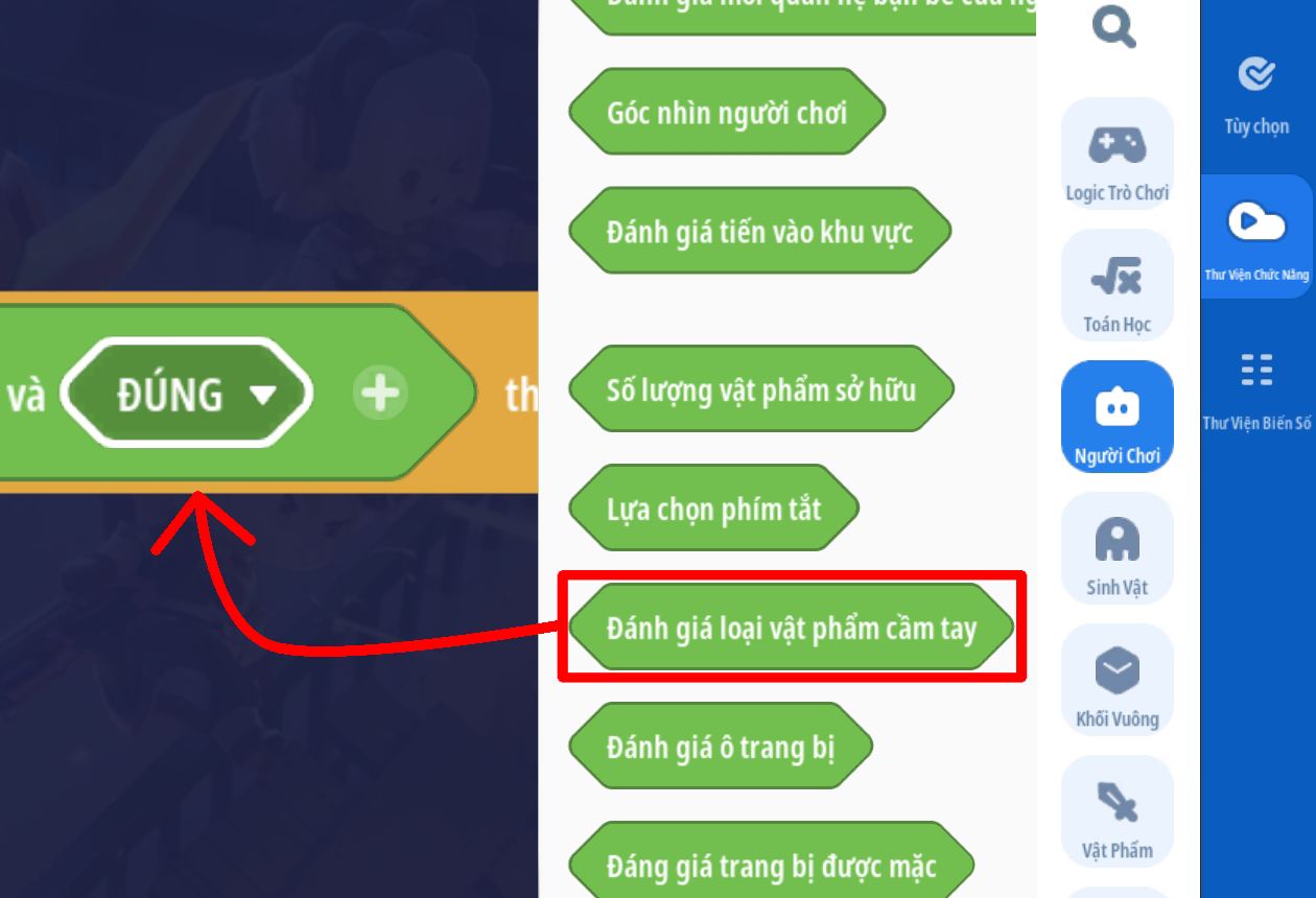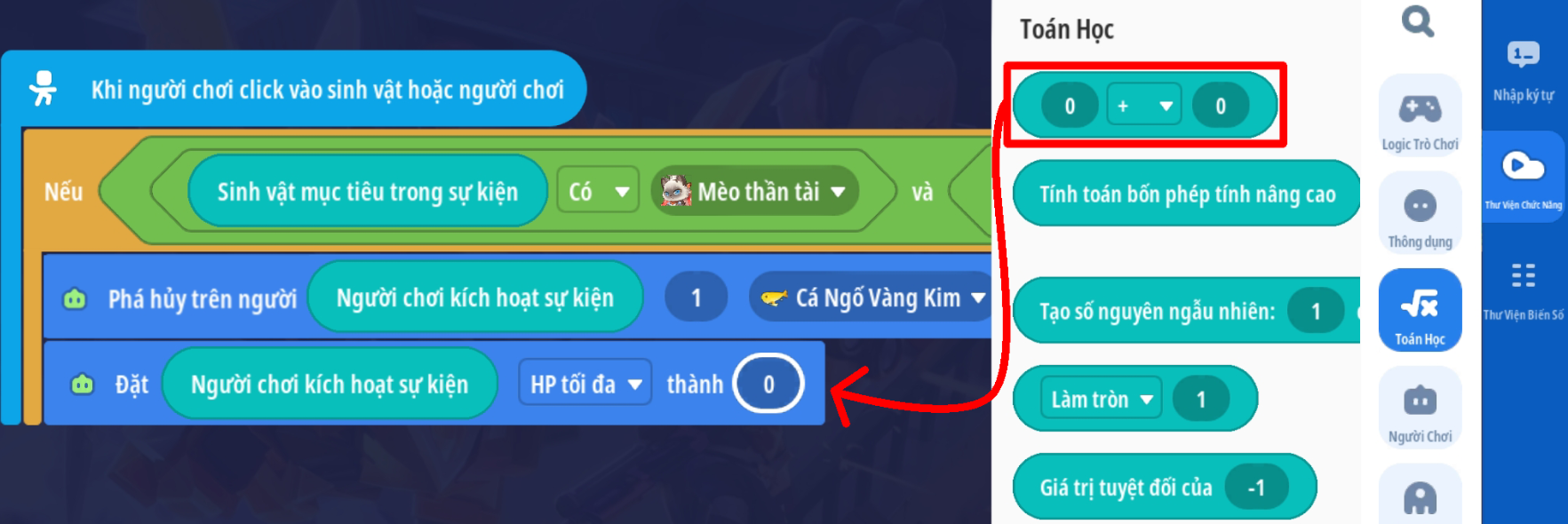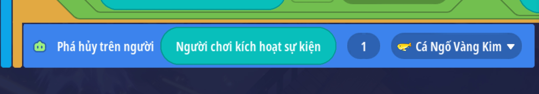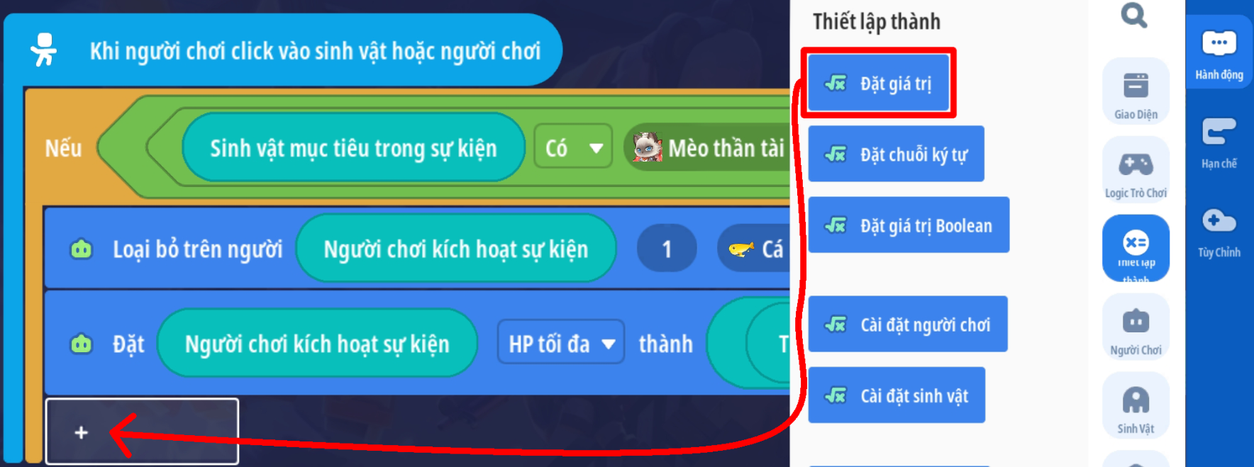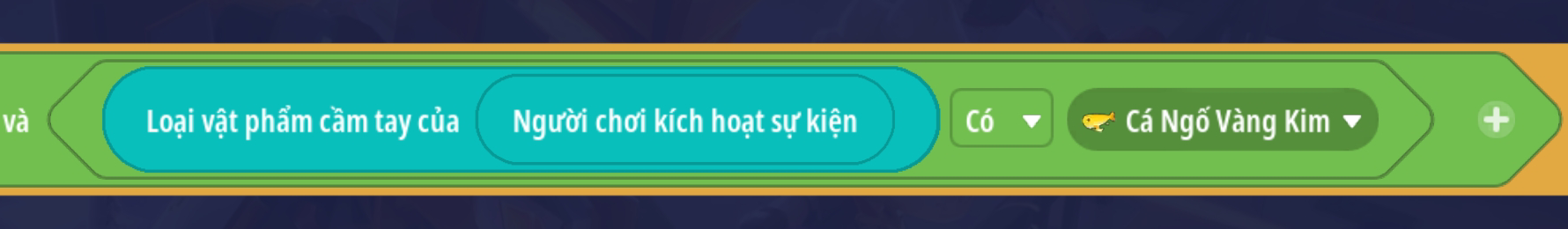 Tạo sự kiện người chơi nhấp vào sinh vật với điều kiện sinh vật mục tiêu trong sự kiện là “Mèo thần tài” và vật phẩm cầm tay của người chơi là Cá Ngố Vàng Kim ( Loại vậy phẩm thích hợp tùy bối cảnh)