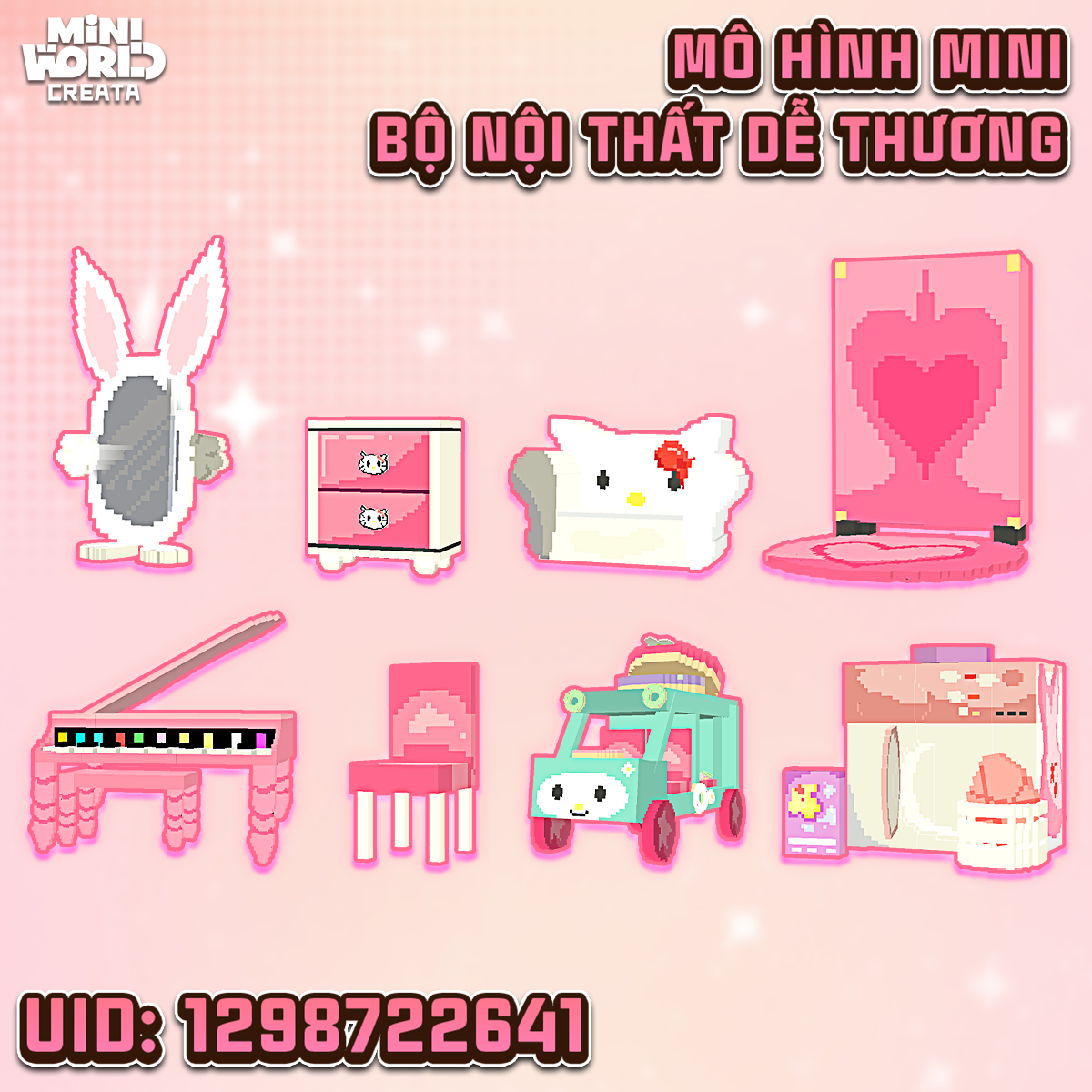 Một bộ sưu tập siêu đáng yêu với gương tai thỏ, sofa Hello Kitty, piano hồng và nhiều món đồ nội thất xinh xắn khác. Rất hợp để trang trí căn phòng trong Mini World thêm lung linh đó nha!