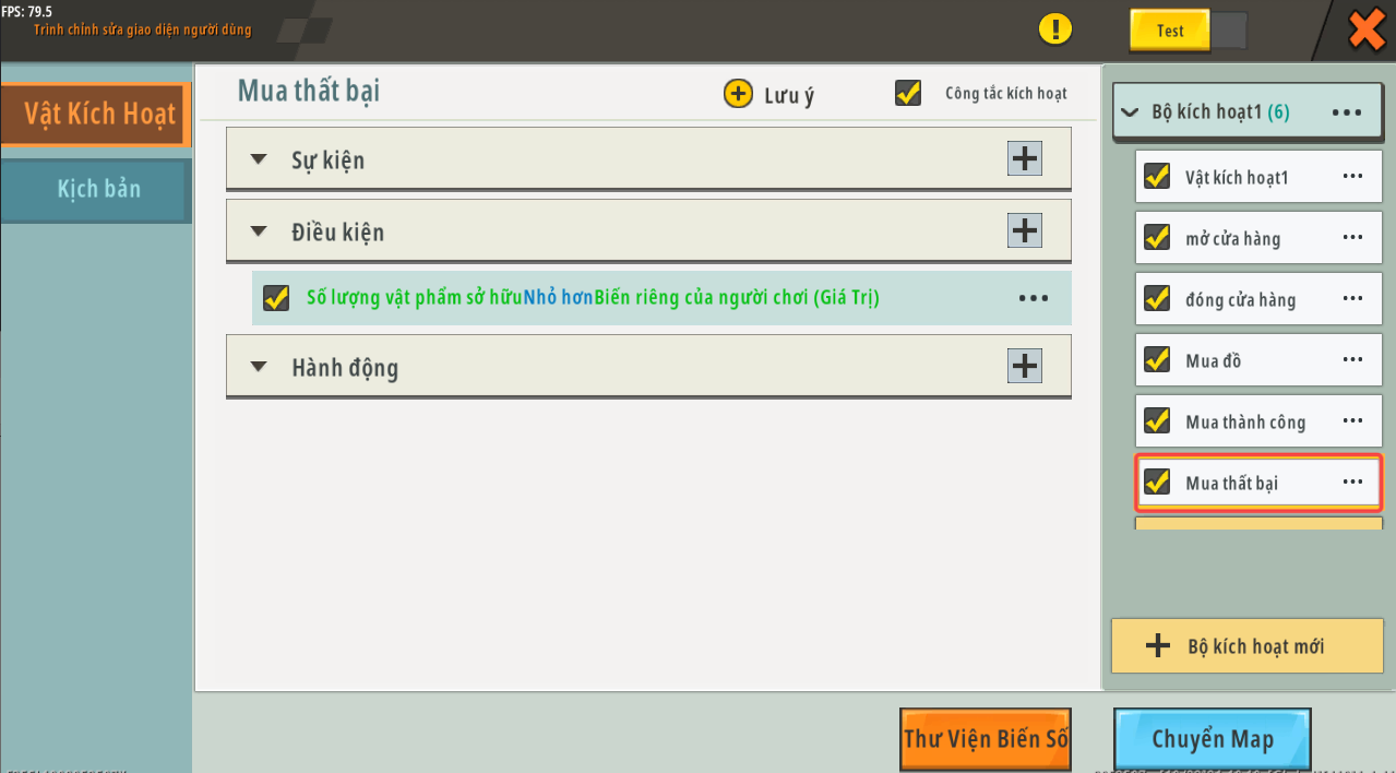 Khi người chơi nhấp vào mua sản phẩm 1, chúng ta cần gán giá trị tương ứng cho biến riêng tư của người chơi “Thanh toán”, “Mặt hàng đã mua”.