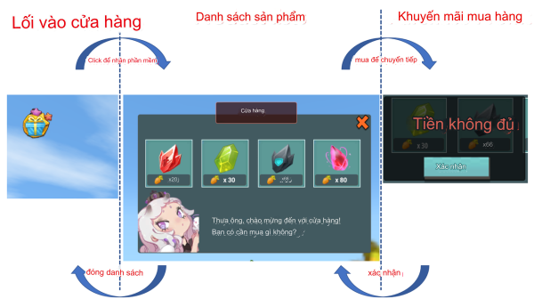 Khi số lượng tiền mà người chơi sở hữu lớn hơn hoặc bằng giá của sản phẩm thì việc mua hàng thành công, người chơi nhận được vật phẩm và tiền của người chơi = tiền hiện có - giá.