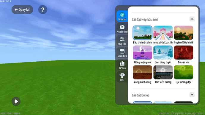Cũng có thể thay đổi kích thước của mặt trời, kích thước của mặt trăng, mật độ của các ngôi sao, tốc độ di chuyển của đám mây, mật độ của mây, độ cao của mây, khoảng cách ngắn nhất của sương mù và khoảng cách xa nhất của sương mù. bằng cách sửa đổi các tham số của hộp bầu trời: