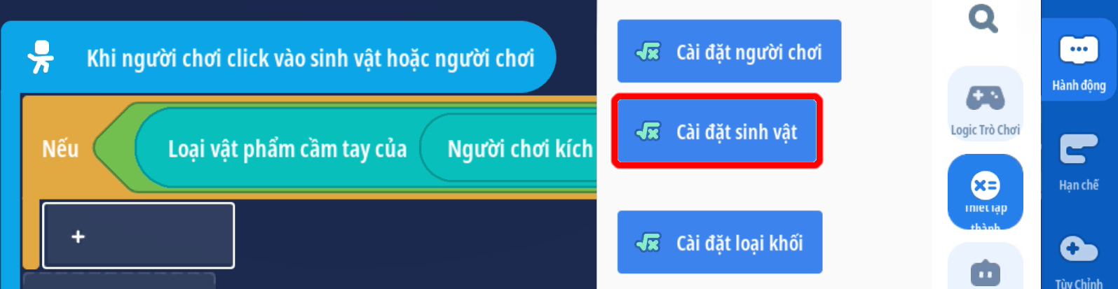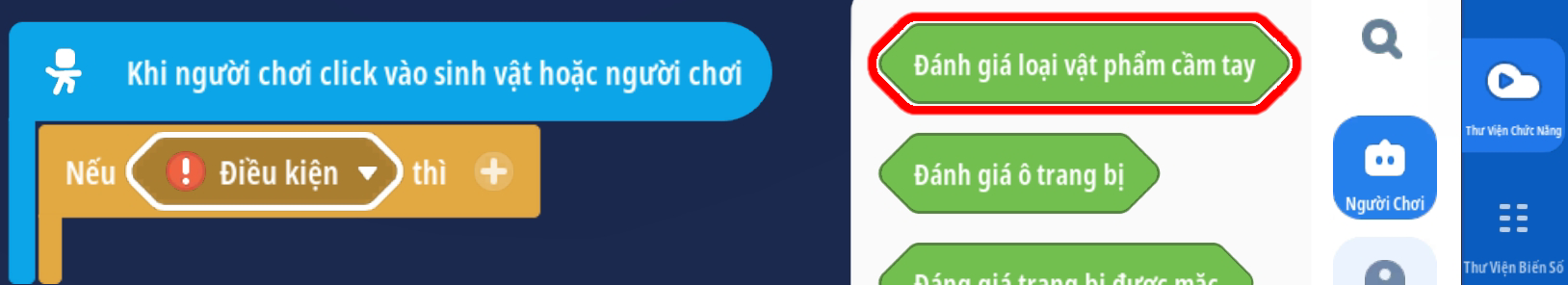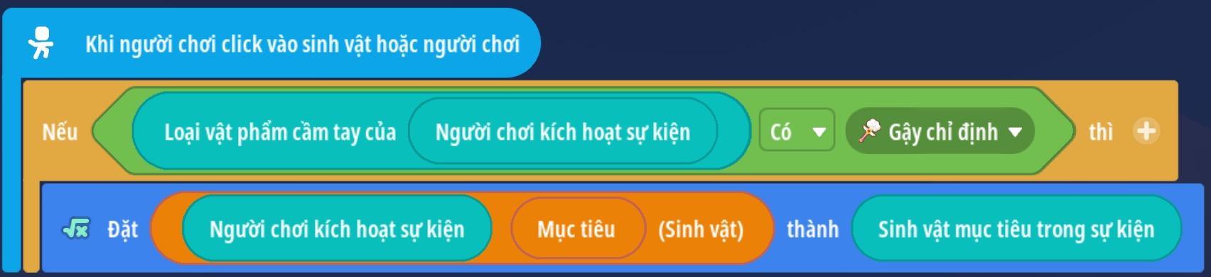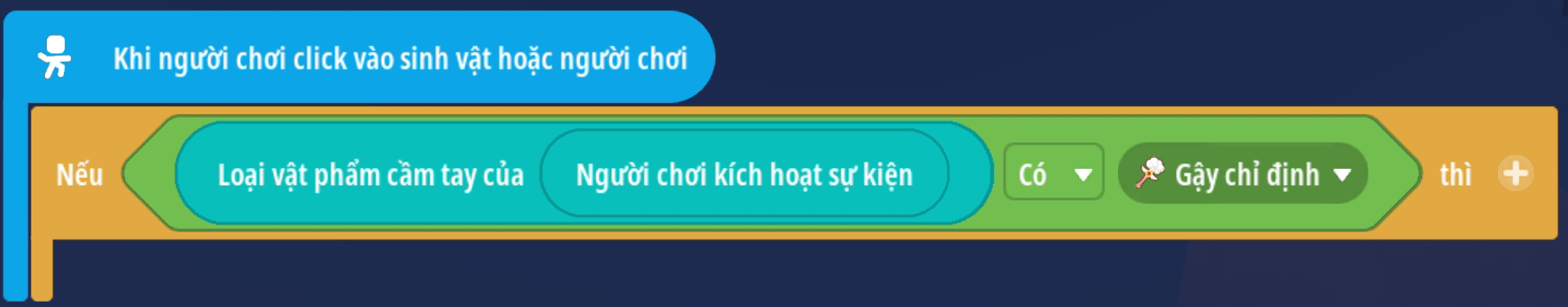 - Sự kiện tùy chỉnh. Bản mẫu: Sự kiện người chơi cầm vật phẩm chỉ định nhấp vào sinh vật mục tiêu