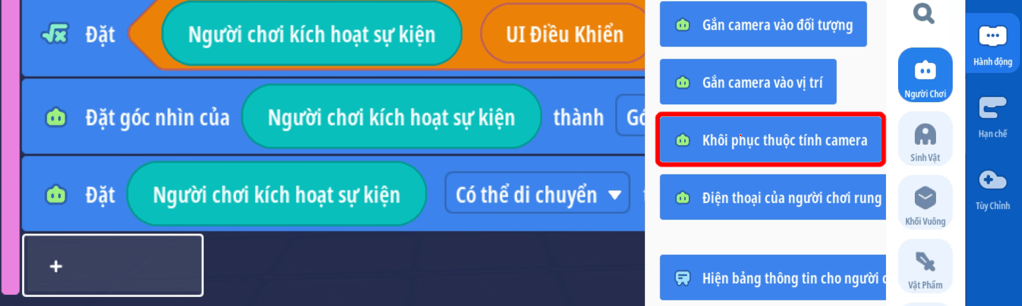 - Tạo mã tự chế với các hành động chỉnh sửa từ trigger 2, thêm hành động khôi phục góc nhìn người chơi