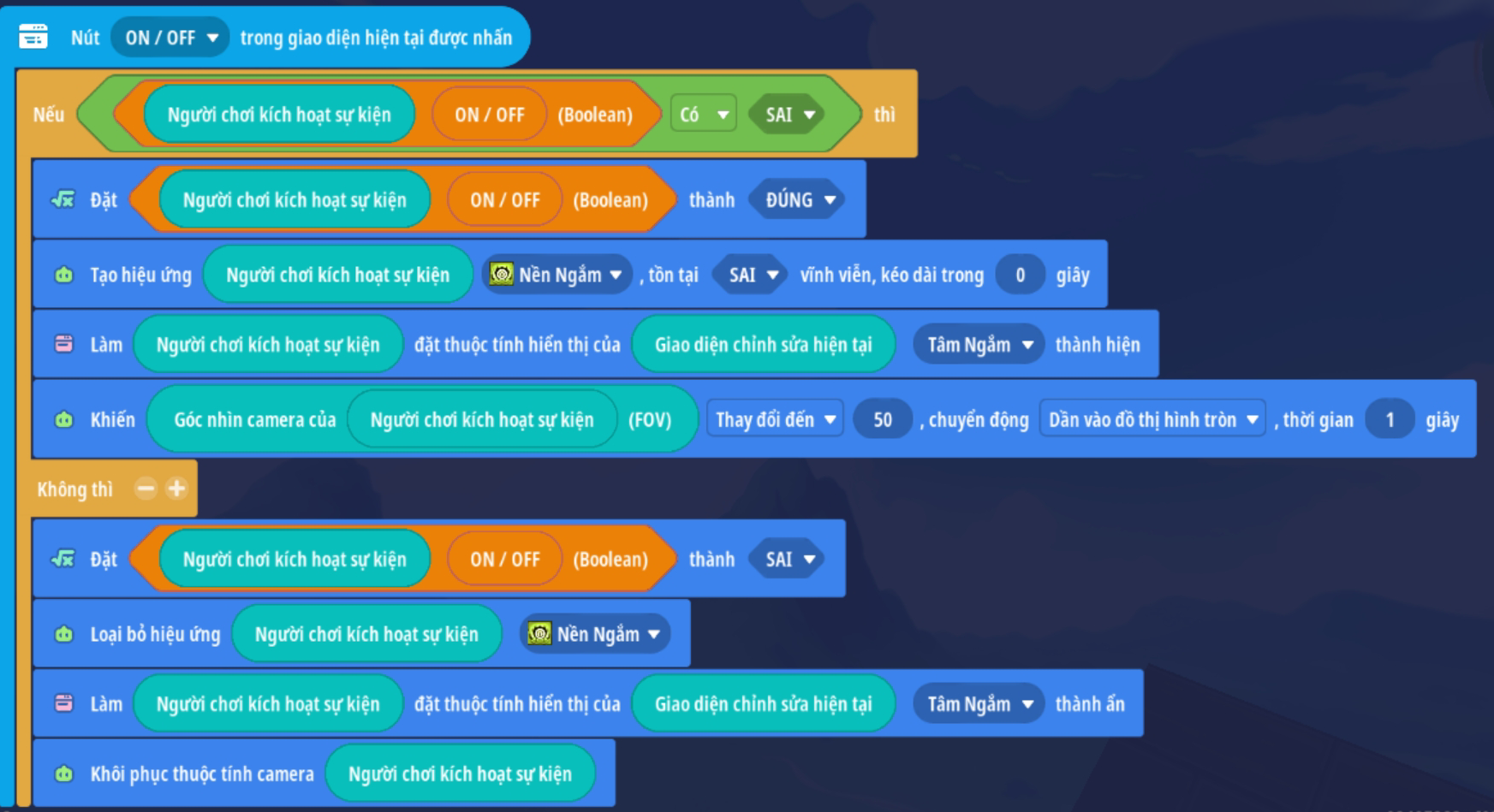 - Đặt giá trị boolean thành Đúng để xác định người chơi vào trạng thái ngắm, thiết lập các yêú tố phụ cần thiết
