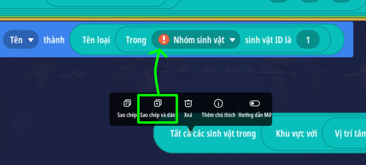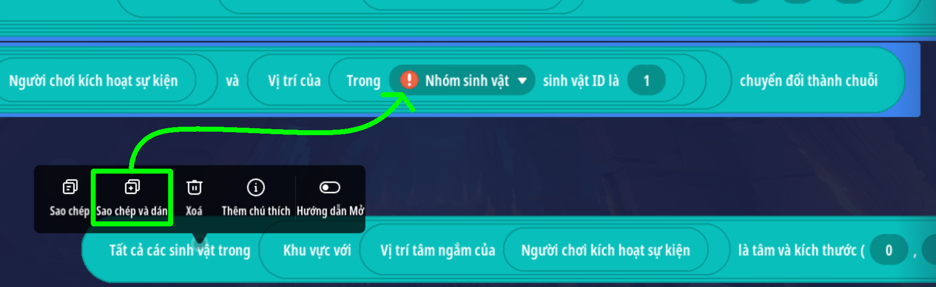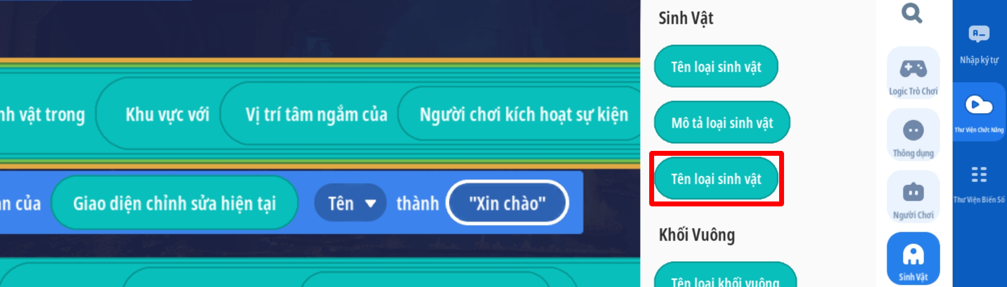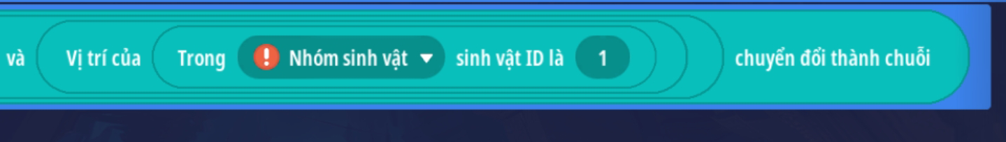 3. Đặt nội dung văn bản thành phần 'Tên' thành tên sinh vật có ID 1 ở khu vực vị trí tâm ngắm người chơi