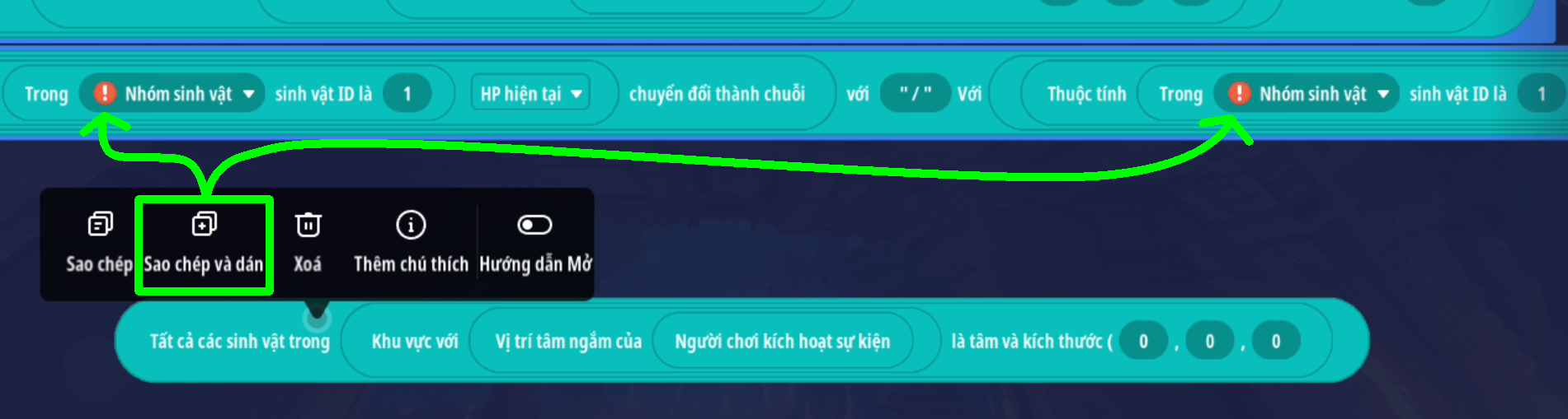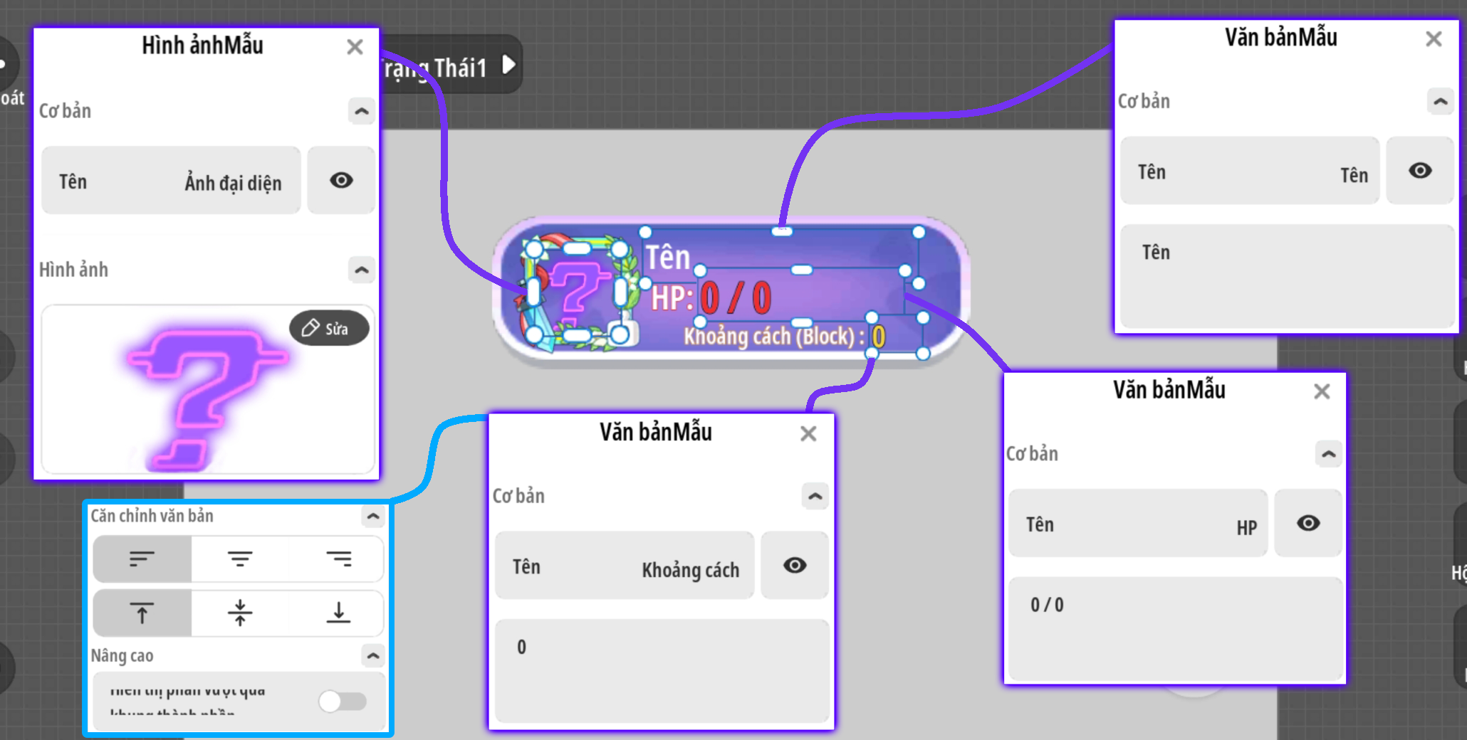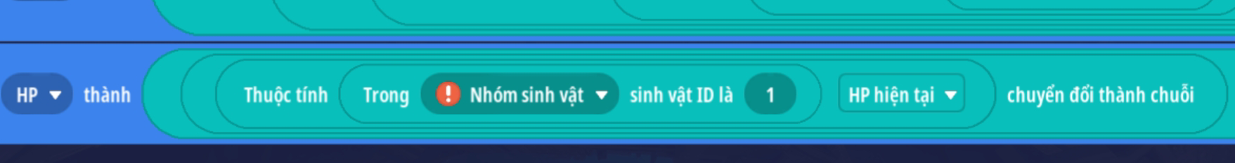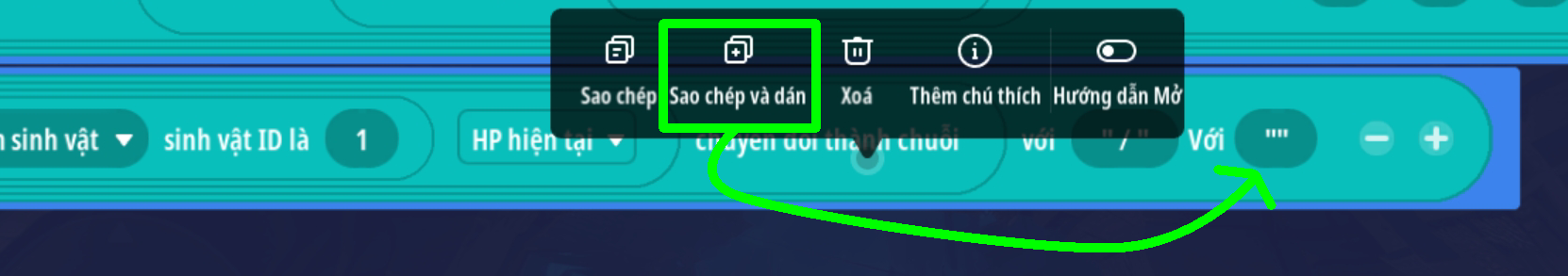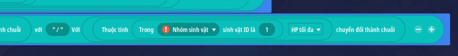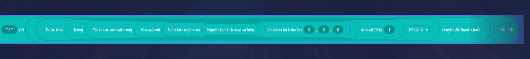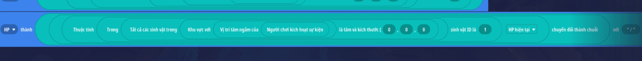 4. Đặt nội dung văn bản thành phần 'HP' thành chuỗi ghép “thuộc tính HP hiện tại / HP tối đa” của sinh vật có ID 1 ở khu vực vị trí tâm ngắm người chơi