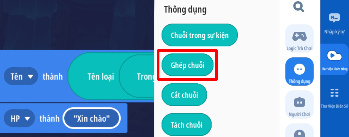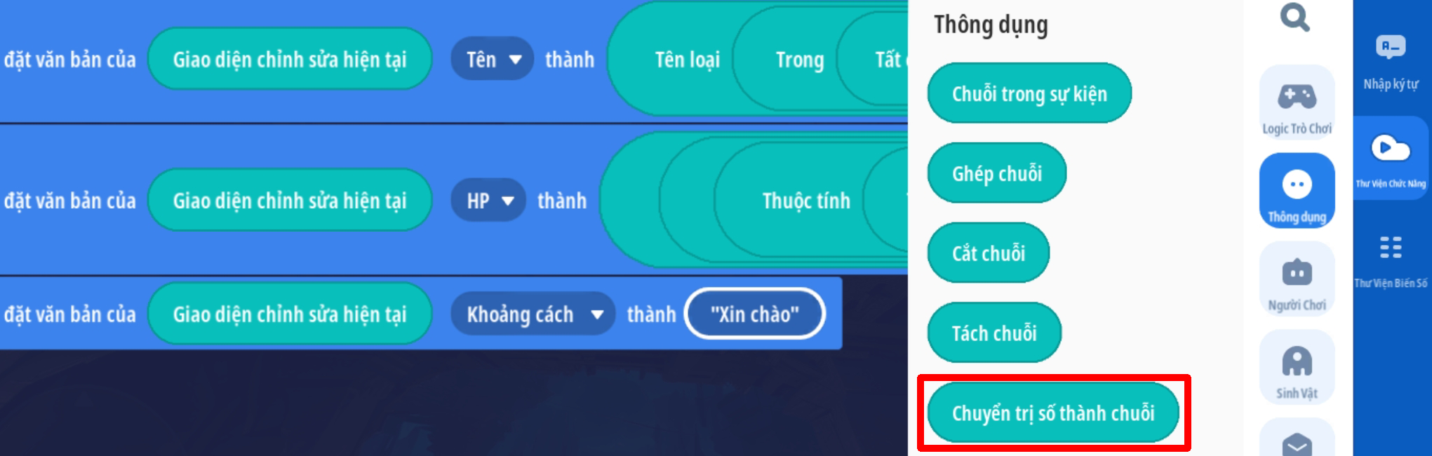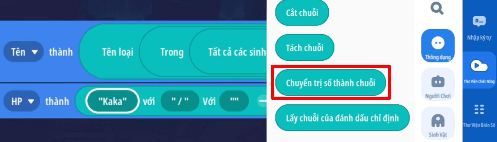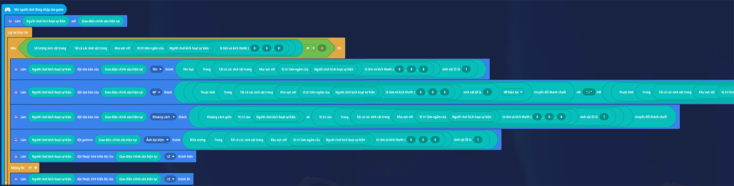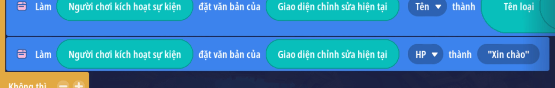 4. Đặt nội dung văn bản thành phần 'HP' thành chuỗi ghép “thuộc tính HP hiện tại / HP tối đa” của sinh vật có ID 1 ở khu vực vị trí tâm ngắm người chơi