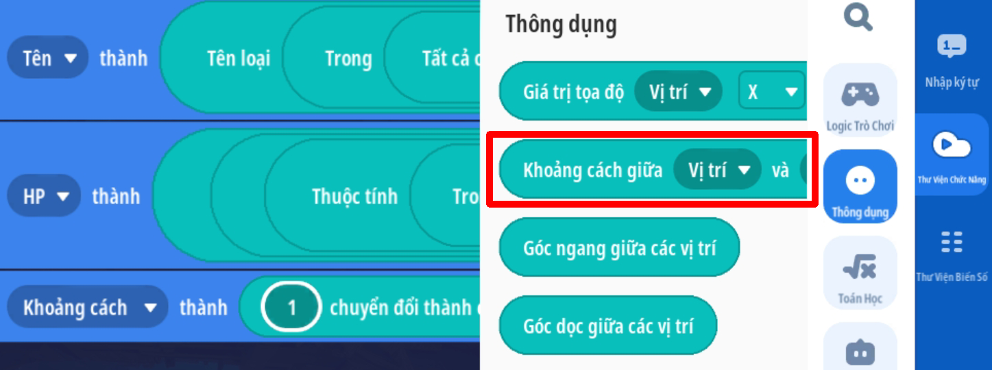 5. Đặt nội dung văn bản thành phần 'Khoảng cách ' thành khoảng cách vị trí giữa người chơi và vị trí sinh vật có ID 1 ở khu vực vị trí tâm ngắm người chơi
