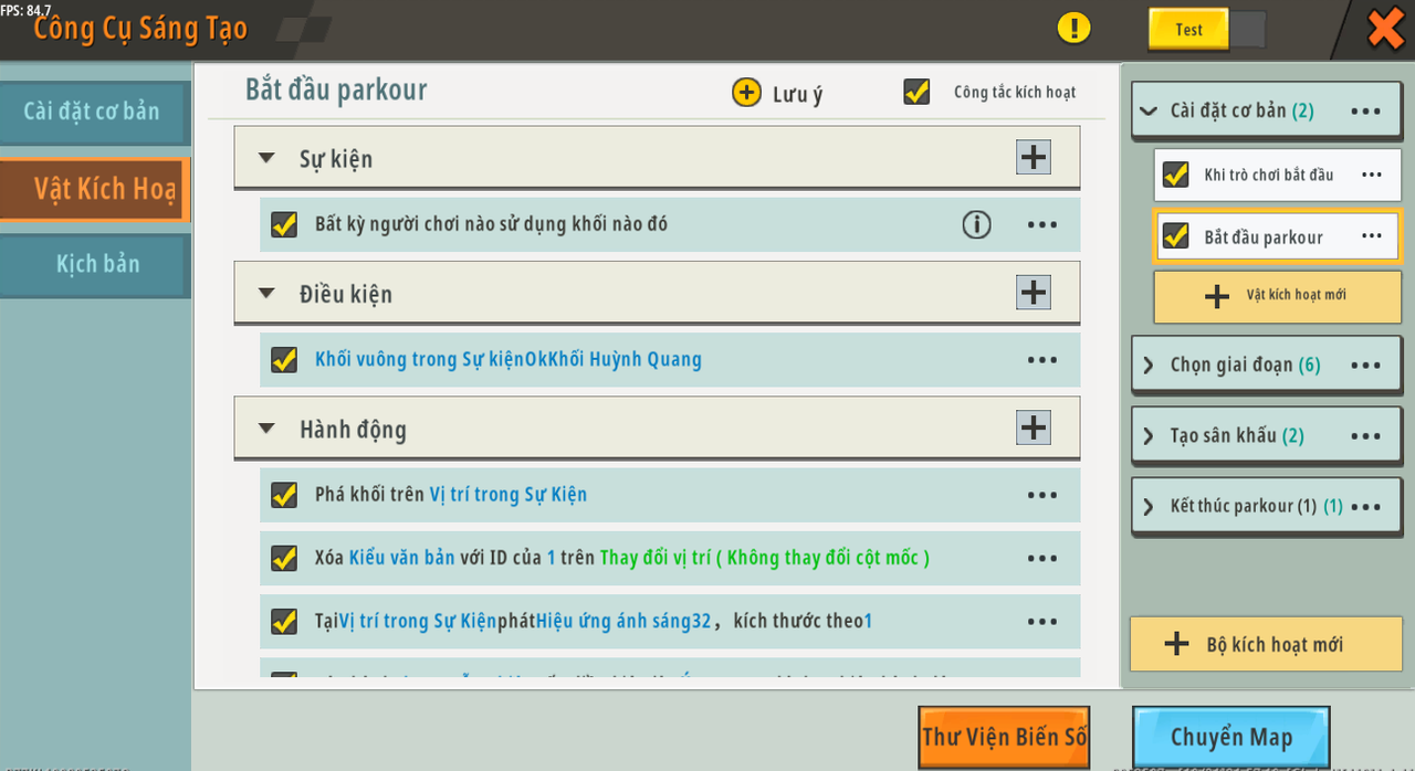 Tên trigger: Bắt đầu parkour Sự kiện: Bất kỳ người chơi nào chạm vào khối Tình trạng: [Loại khối trong sự kiện] [Có] [Khối tinh thể huỳnh quang] Hoạt động: Phá hủy khối trên [Vị trí sự kiện] Xóa [Hộp văn bản] có ID là [1] trên [Bù vị trí (Vị trí ban đầu đã cố định) ''<game start> dịch chuyển dọc theo trục tọa độ <0> , <1> , <0>'' ] Phát [Hiệu ứng ánh sáng32] trên [Vị trí sự kiện], kích thước là [1] Chạy [Chọn ngẫu nhiên] , kiểm tra xem điều kiện có đúng không, sau đó chạy hành động