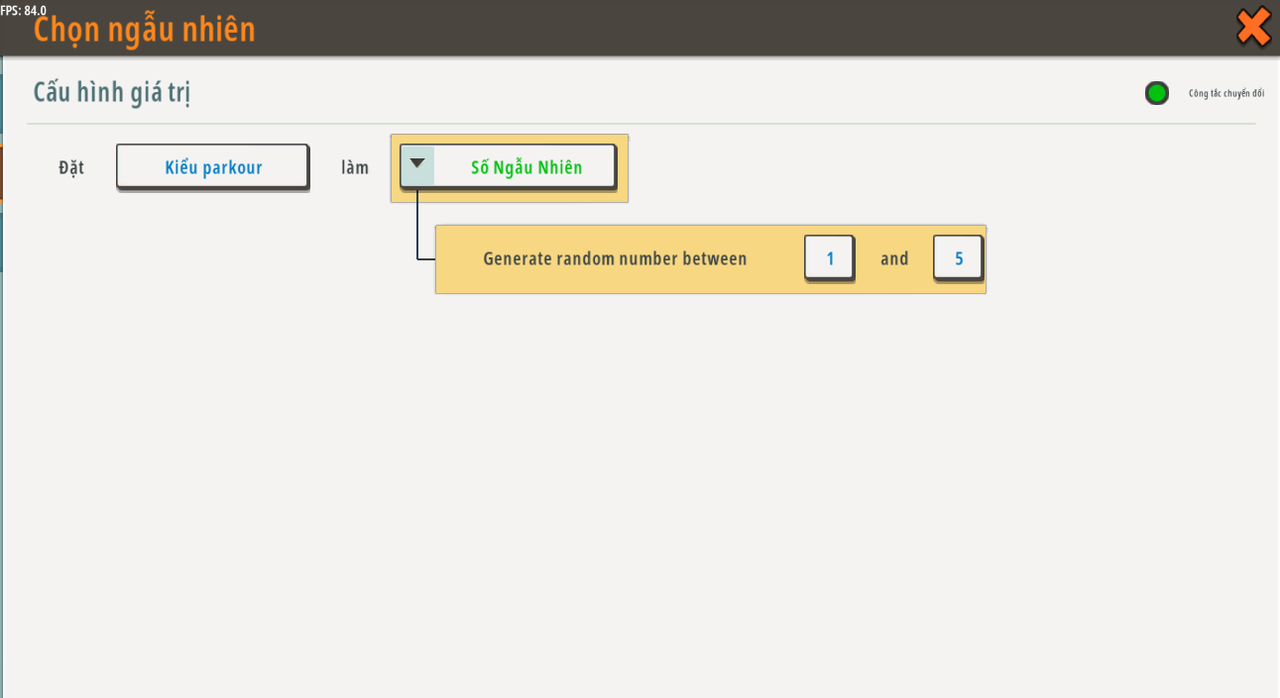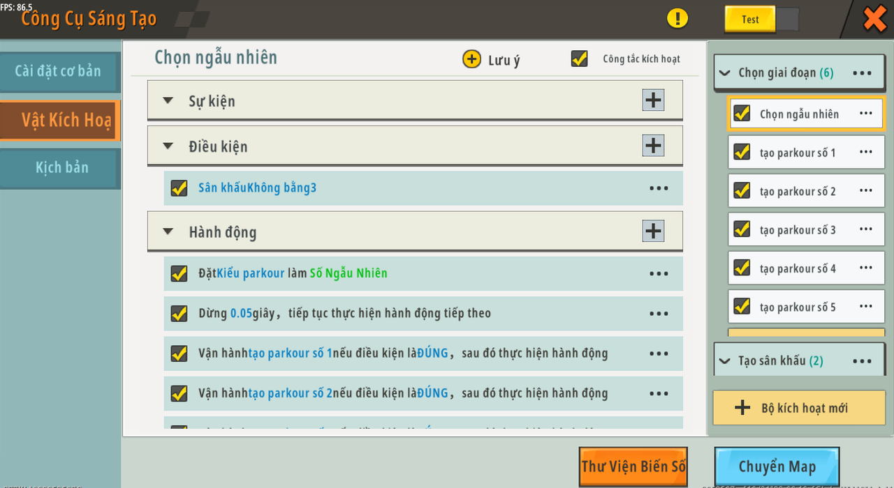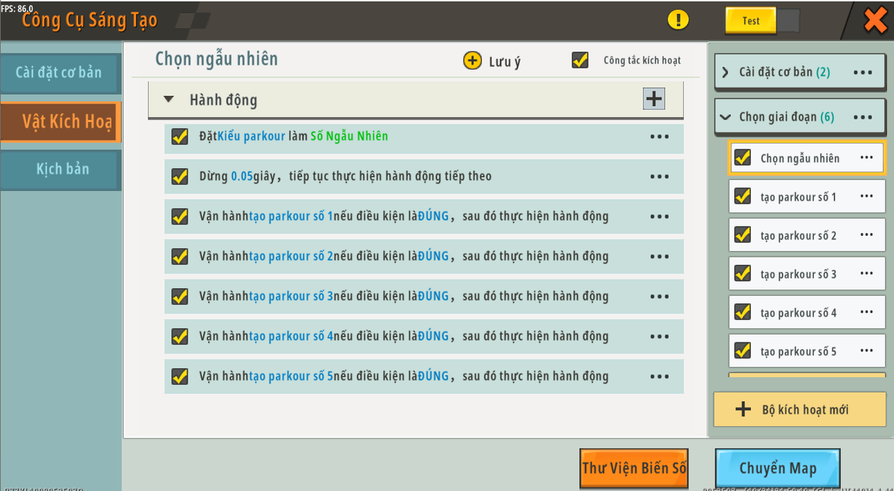 Tên trigger: chọn ngẫu nhiên Sự kiện: không áp dụng Tình trạng: [giai đoạn] [Không bằng] [3]*¹² Hoạt động: Đặt [loại parkour] làm [Số ngẫu nhiên ''Tạo số giữa <1> và <5>''] Đợi [0,05] giây và tiếp tục thực hiện hành động tiếp theo. Chạy create [parkour no.1] , kiểm tra xem điều kiện có phải là [TRUE] , sau đó chạy hành động Chạy create [parkour no.2] , kiểm tra xem điều kiện có phải là [TRUE] , sau đó chạy hành động Chạy create [parkour no.3] , kiểm tra xem điều kiện có phải là [TRUE] , sau đó chạy hành động Chạy create [parkour no.4] , kiểm tra xem điều kiện có phải là [TRUE] , sau đó chạy hành động Chạy create [parkour no.5] , kiểm tra xem điều kiện có phải là [TRUE] , sau đó chạy hành động