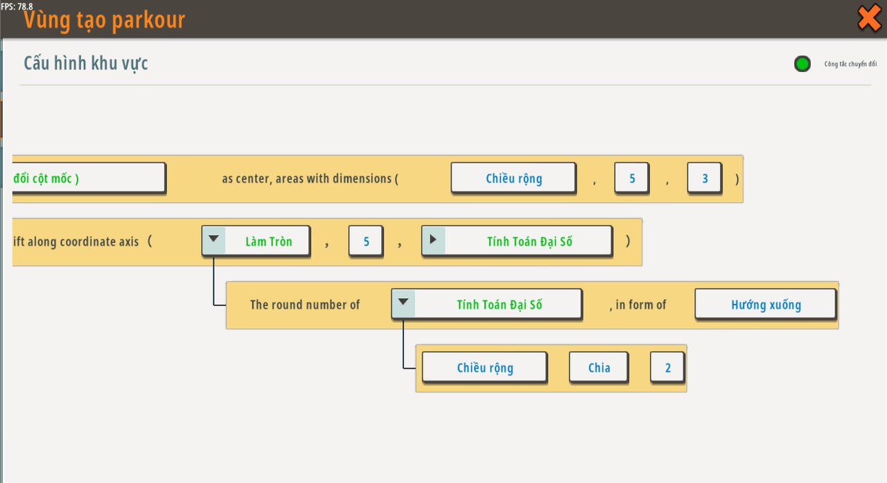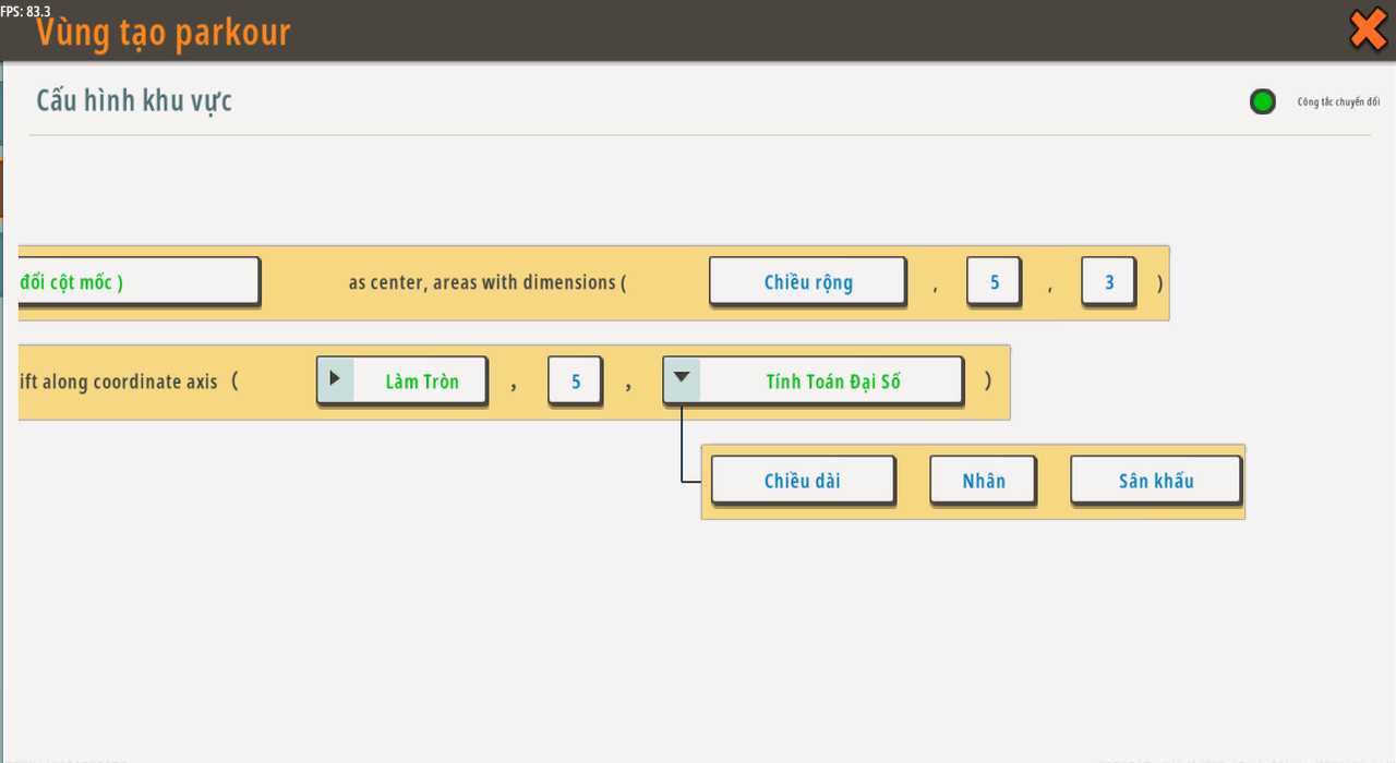 Đặt [tạo parkour mới] làm [Chuyển đổi vị trí thành khu vực '' Đặt <Bù lệch vị trí (Vị trí ban đầu đã cố định) {《điểm bắt đầu》. dịch chuyển dọc theo trục tọa độ ( 《[Vòng {Số vòng của /Phép toán số <chiều rộng của giai đoạn> <Chia> <2>/ , dưới dạng /Downward/ } ] 》 , 《5》 , 《Phép toán số [ {chiều dài của sân khấu} {Multiply} {stage} ] 》 > làm trung tâm, khu vực có kích thước ( <width of stage> , <5> , <3> ) ''