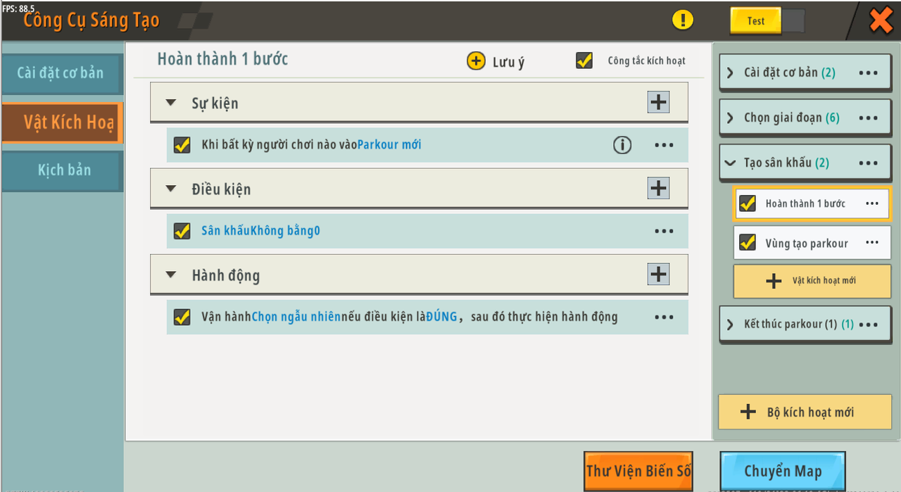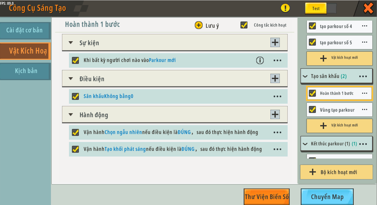 Tên trigger: Khi người chơi hoàn thành một màn Sự kiện: Khi bất kỳ người chơi nào tham gia [tạo parkour mới] Tình trạng: [giai đoạn] [Không bằng] [0] Hoạt động: Chạy [Chọn ngẫu nhiên] , kiểm tra xem điều kiện có đúng không, sau đó chạy hành động Chạy [tạo khối sáng bóng] , kiểm tra xem điều kiện có đúng không, sau đó chạy hành động*¹¹