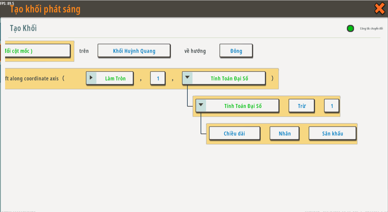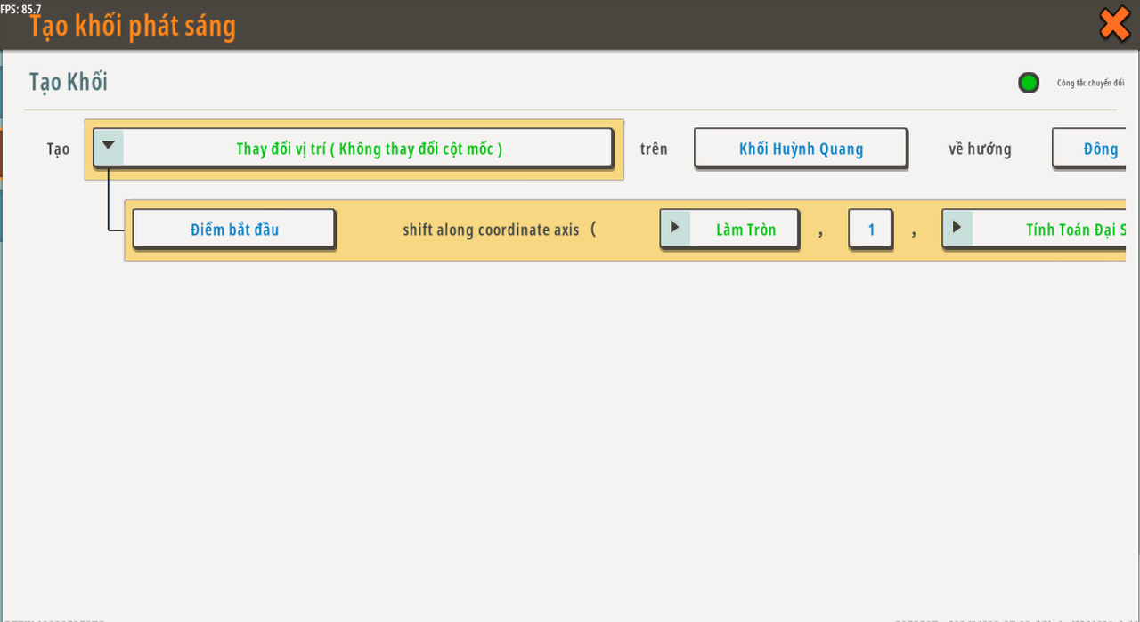 Tạo [Khối sáng bóng] trên [ Bù vị trí (Vị trí ban đầu đã cố định) {《điểm bắt đầu》 dịch chuyển dọc theo trục tọa độ ( 《[Vòng {Số vòng của /Hoạt động số <chiều rộng của giai đoạn> <Chia> <2>/ , trong dạng /Downward/ } ] 》 , 《1》 , 《Phép toán số [ / {độ dài của giai đoạn} {Nhân} {giai đoạn} ] / {Giảm} {1} 》 ]