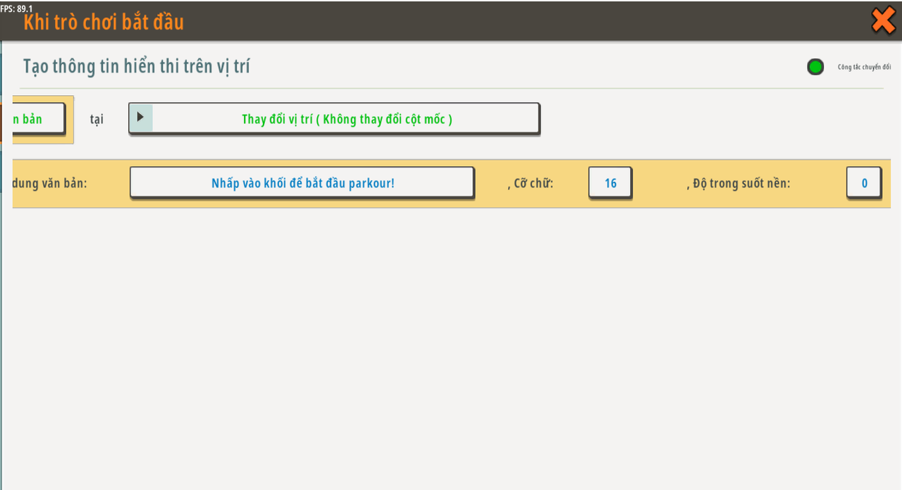 Tên trigger: Khi trò chơi bắt đầu Sự kiện: Được kích hoạt khi trò chơi được tạo Tình trạng: N/A (không áp dụng) Hành động: Tạo [Khối pha lê huỳnh quang]*¹ khi [bắt đầu trò chơi]*² hướng [Đông] Tạo [Nội dung hộp văn bản ''Hộp văn bản: <Nhấp vào khối để bắt đầu parkour!> , Cỡ chữ: <16> , Độ mờ nền: <0> %, ID: <1> ''*³] trên [Bù vị trí (Bản gốc) vị trí cố định) ''<game start> dịch chuyển dọc theo trục tọa độ <0> , <1> , <0>'' ]