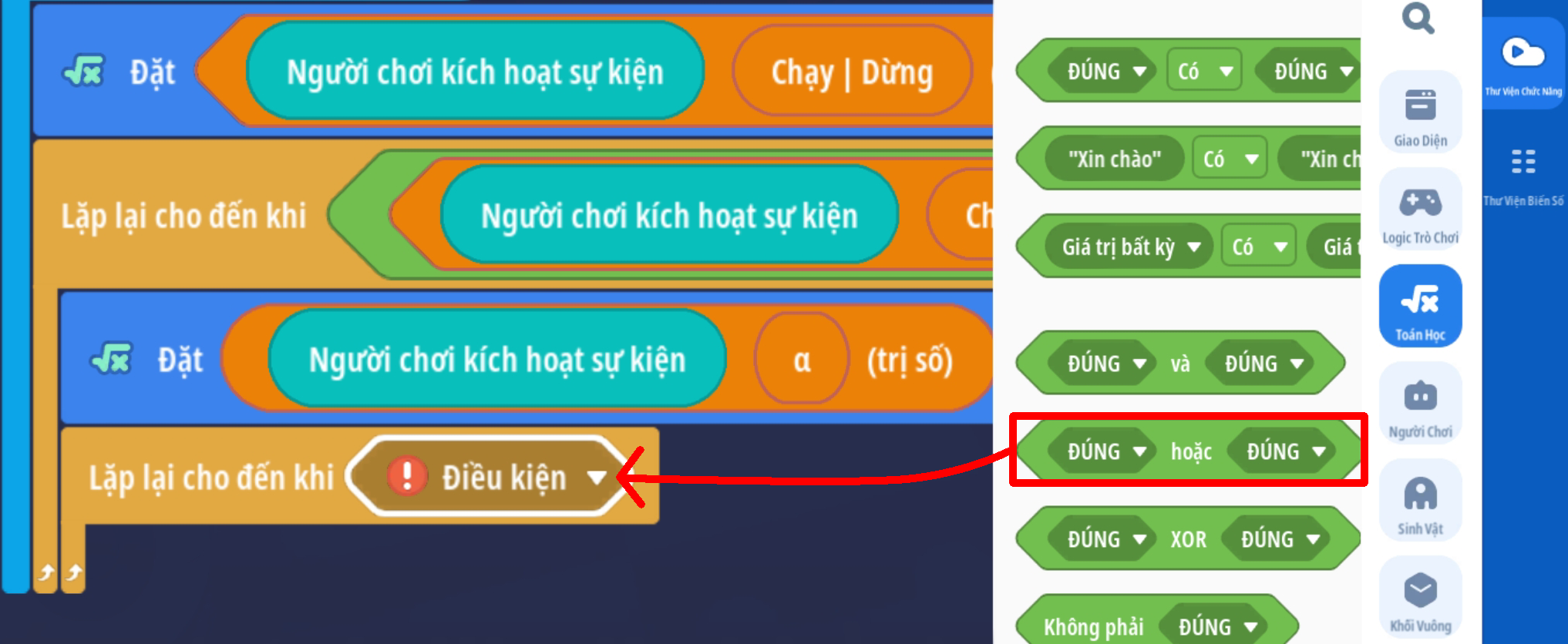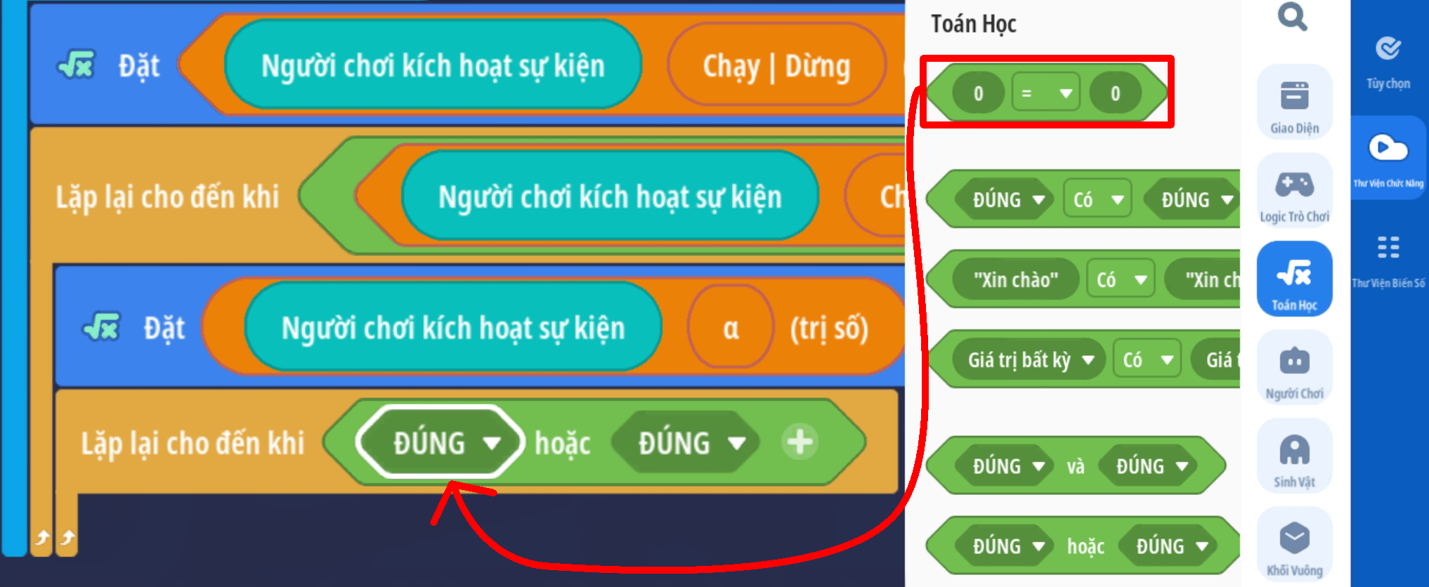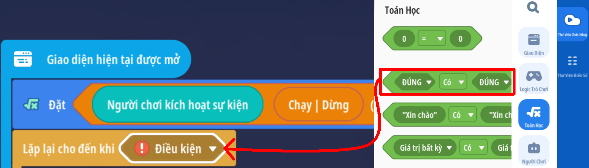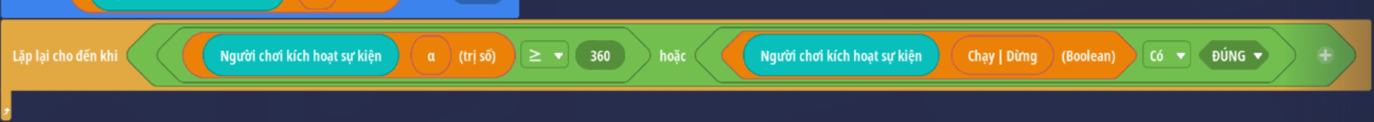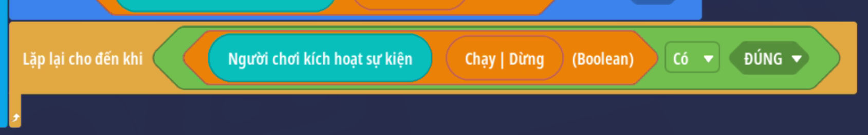 - Tạo vòng lặp chạy đến khi giá trị Boolean là Đúng ( Trò chơi ngừng hoạt động )