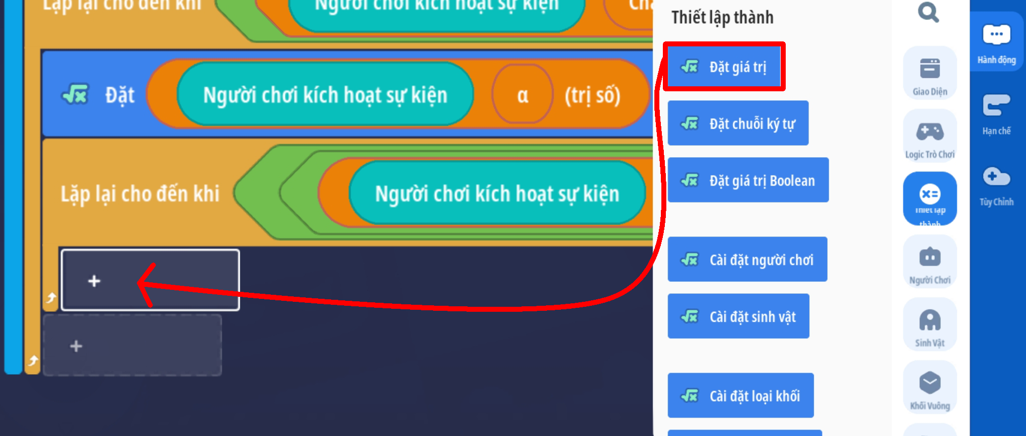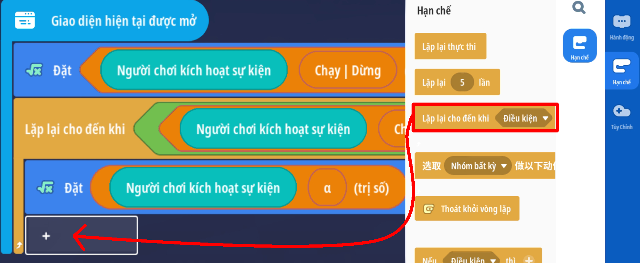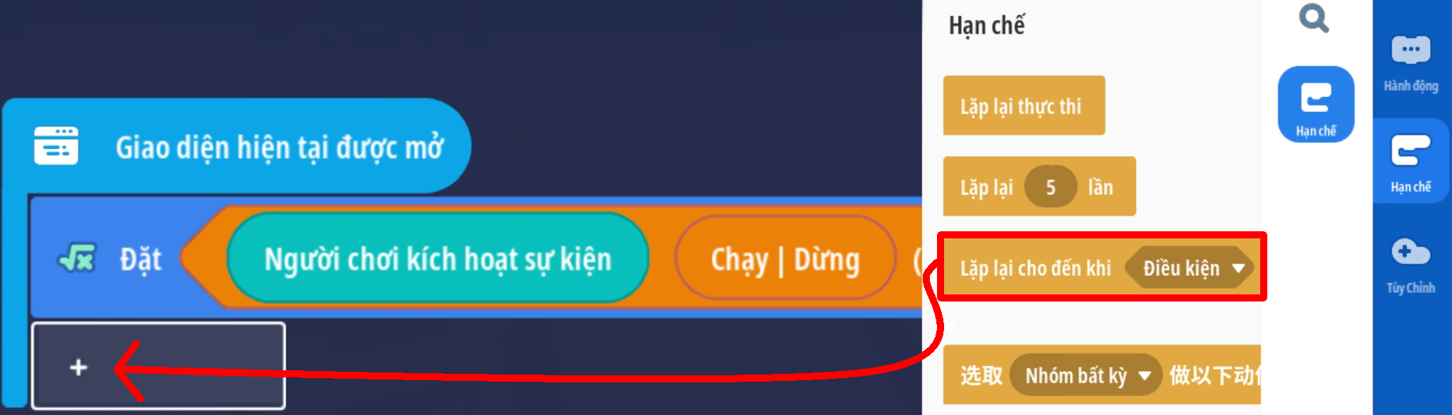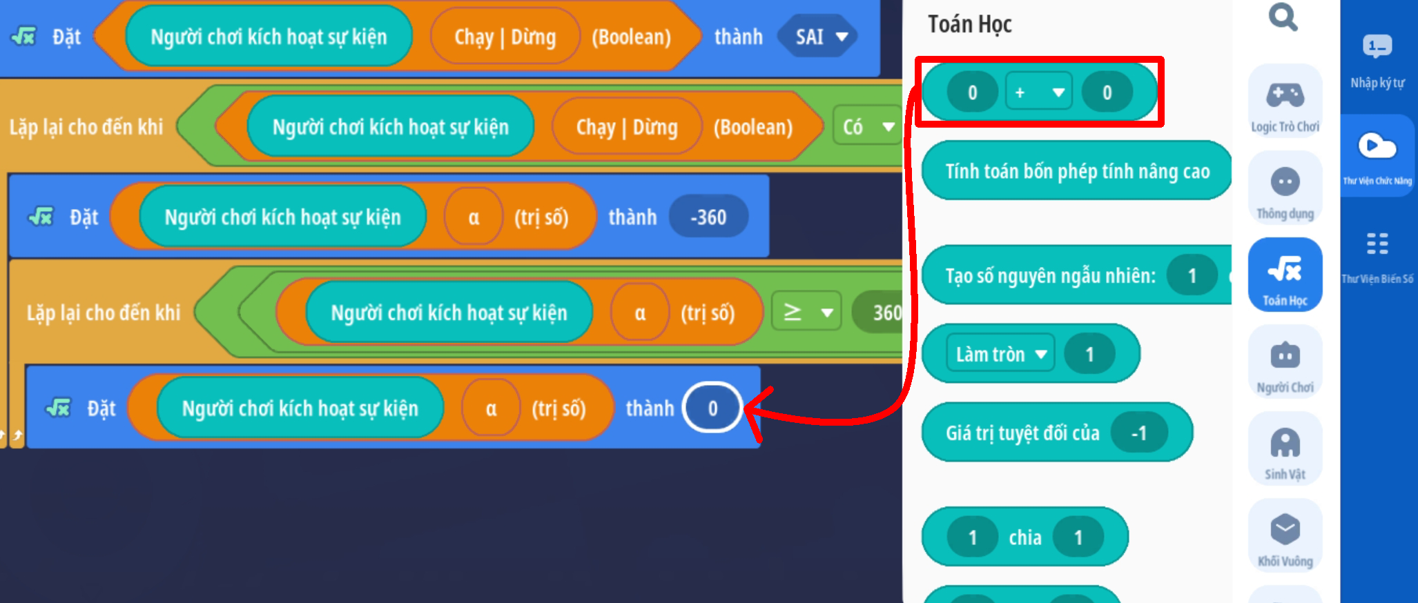 - Tạo vòng lặp chạy đến khi giá trị Boolean là Đúng ( Trò chơi ngừng hoạt động )