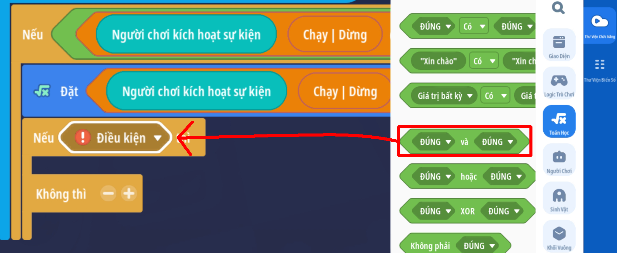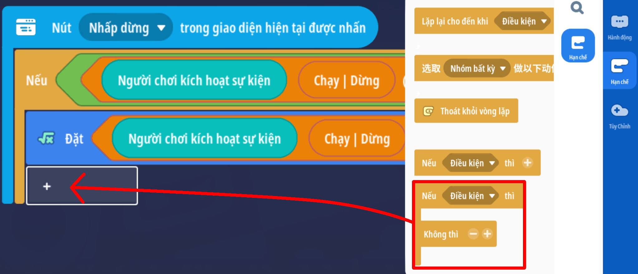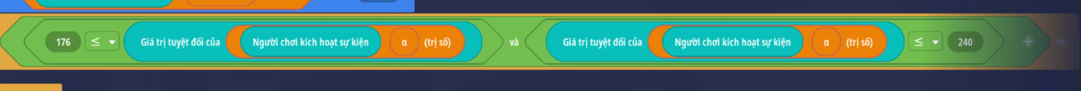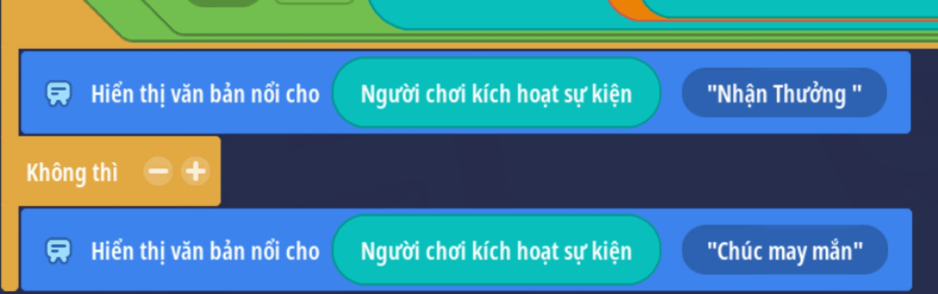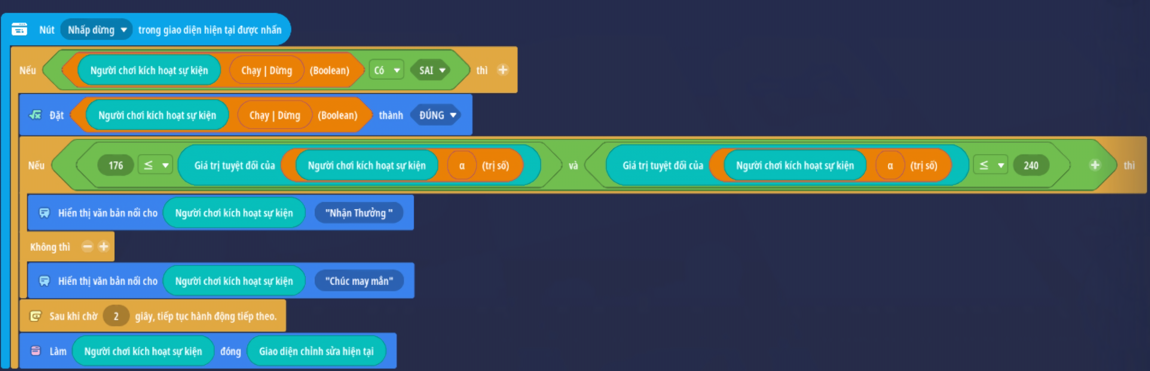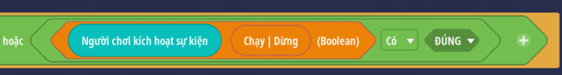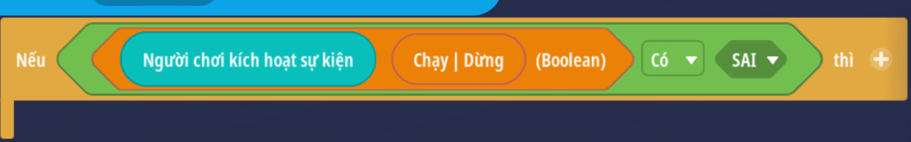 - Tạo sự kiện người chơi nhấp nút, thêm điều kiện giá trị Boolean là Sai ( Trò chơi đang hoạt động )
