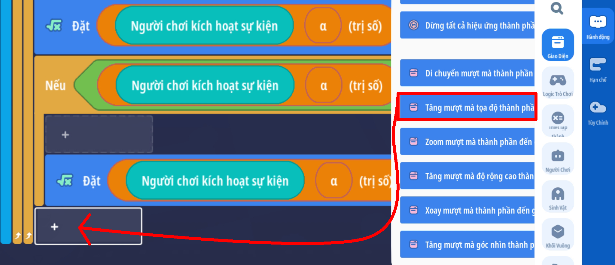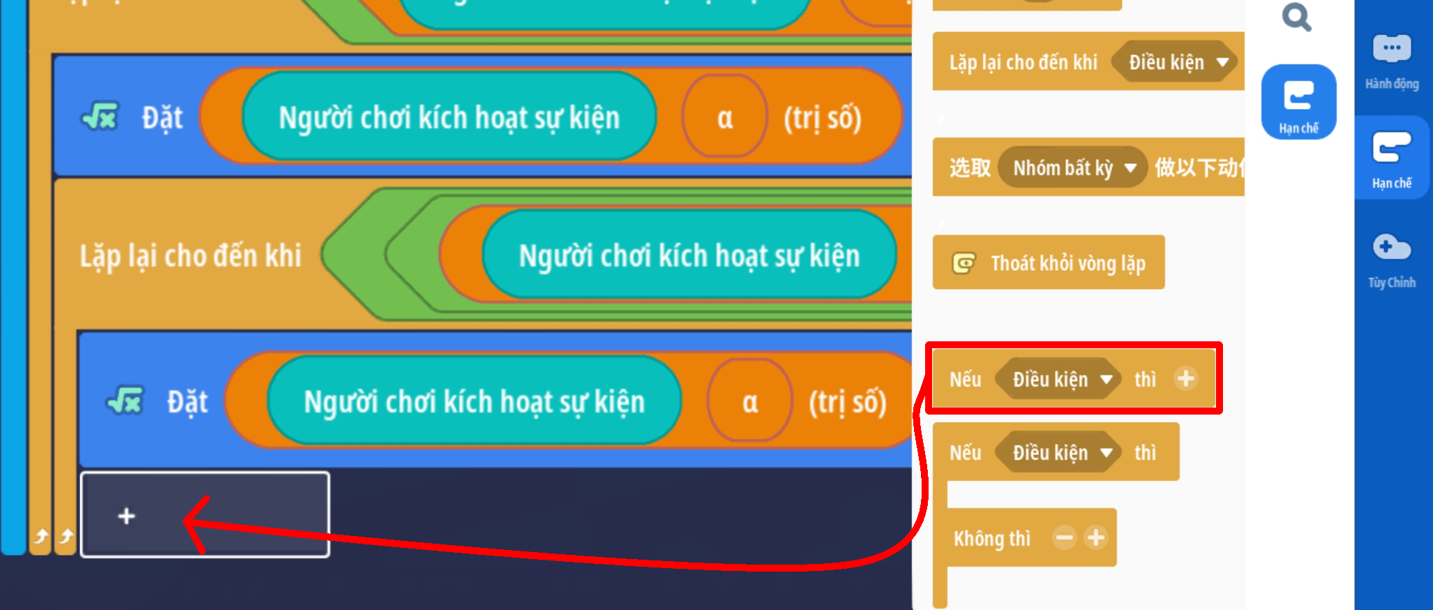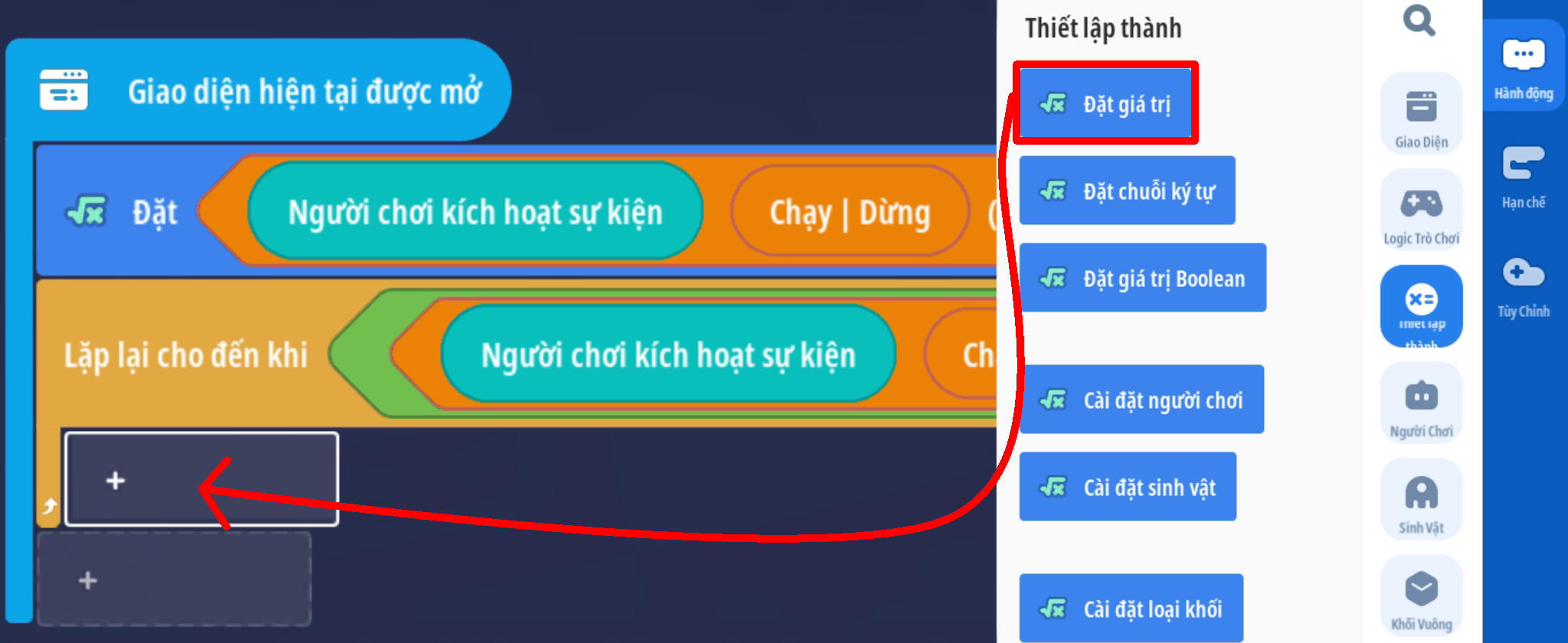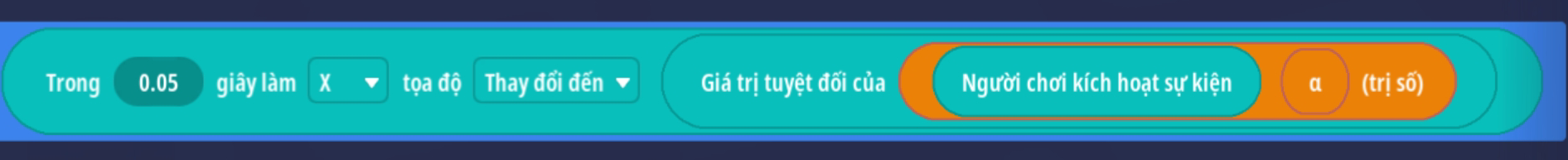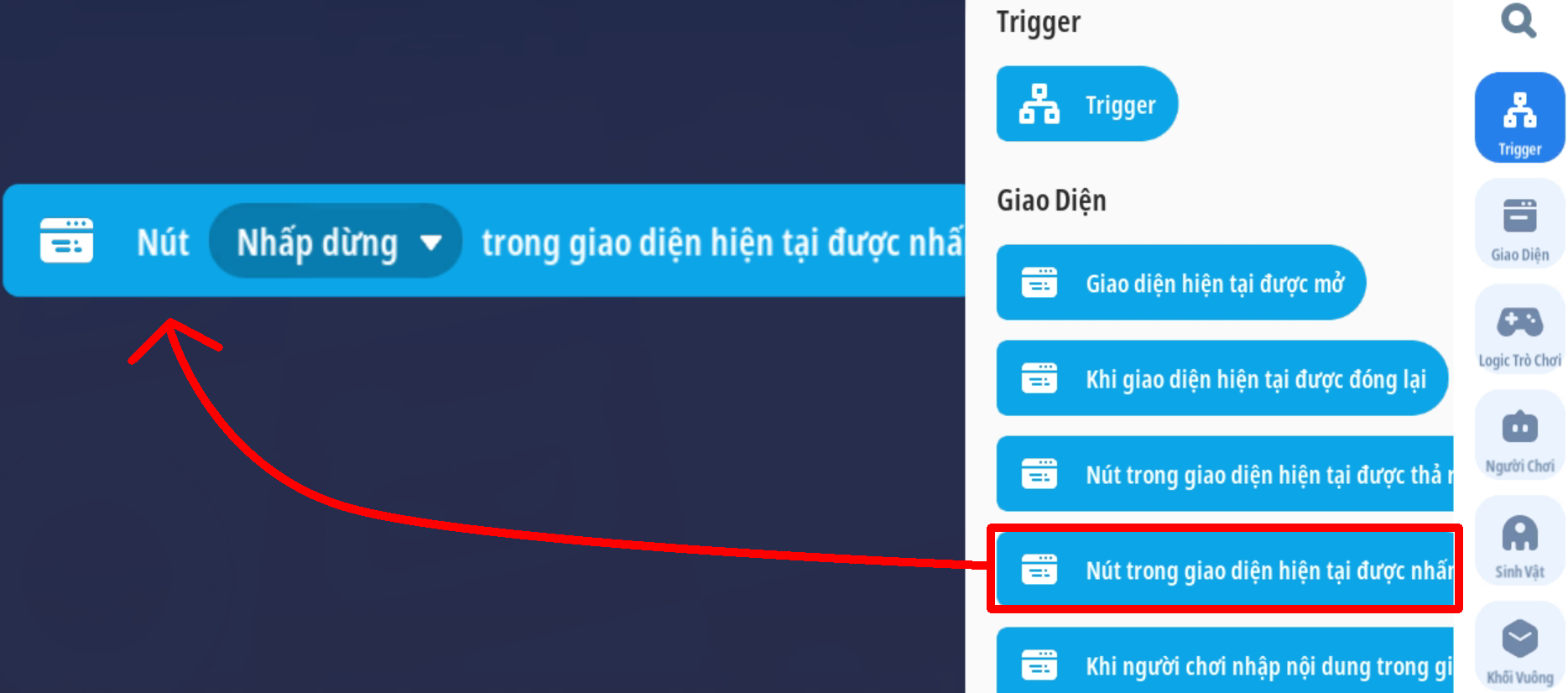 - Tạo sự kiện người chơi nhấp nút, thêm điều kiện giá trị Boolean là Sai ( Trò chơi đang hoạt động )