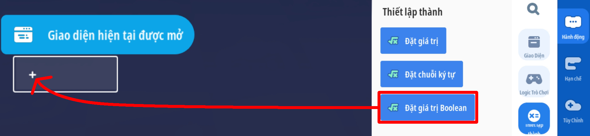 - Đặt giá trị Boolean thành Đúng ( ( Trò chơi ngừng hoạt động )
