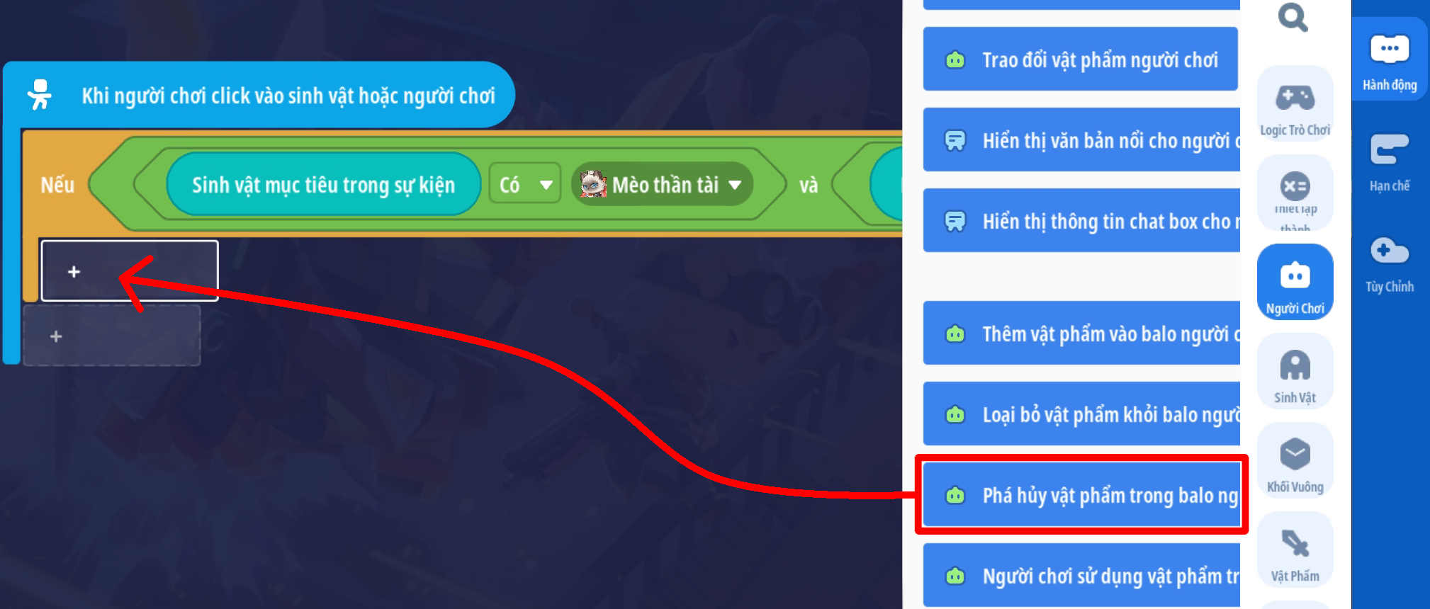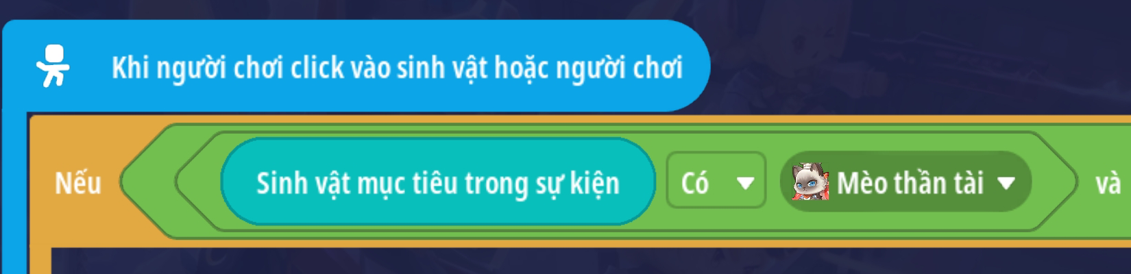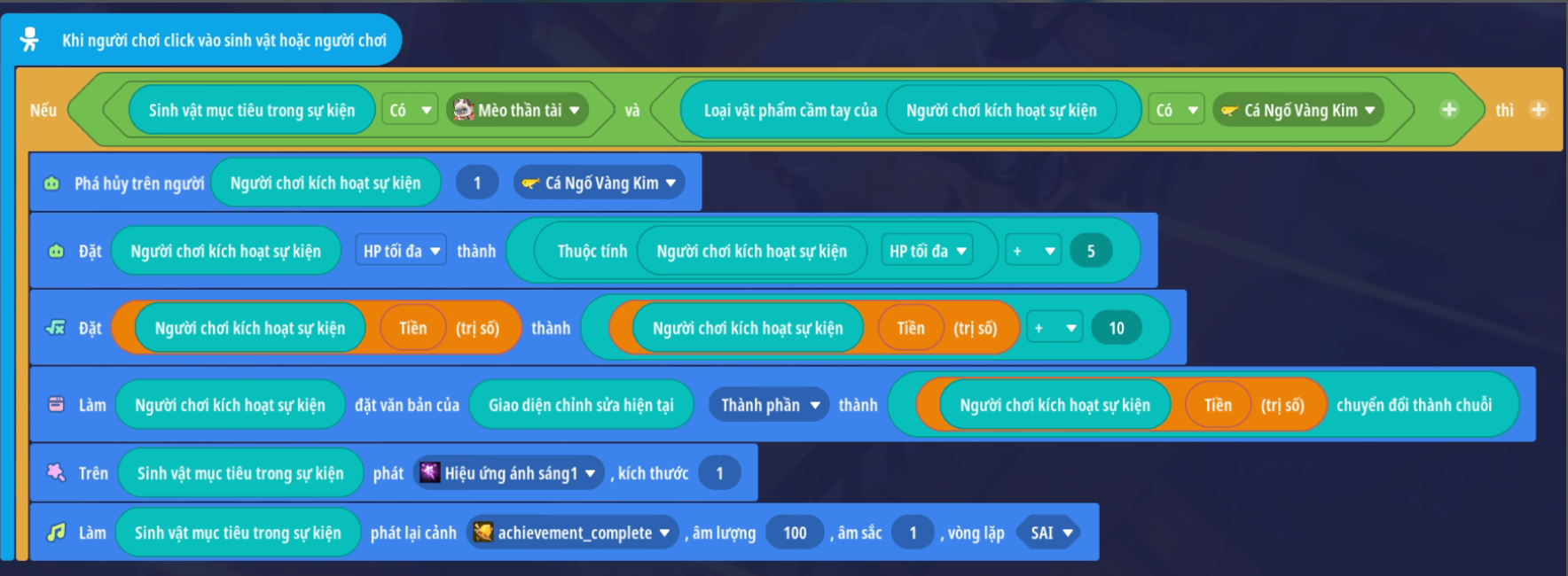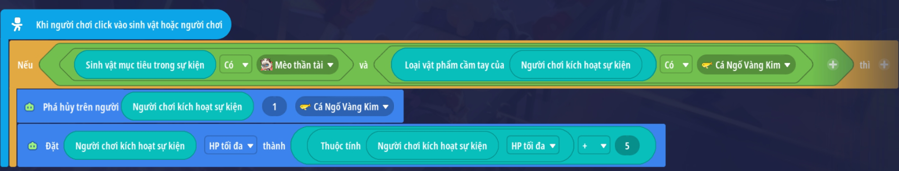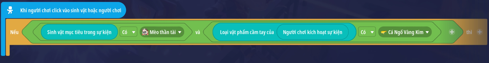 Tạo sự kiện người chơi nhấp vào sinh vật với điều kiện sinh vật mục tiêu trong sự kiện là “Mèo thần tài” và vật phẩm cầm tay của người chơi là Cá Ngố Vàng Kim ( Loại vậy phẩm thích hợp tùy bối cảnh)
