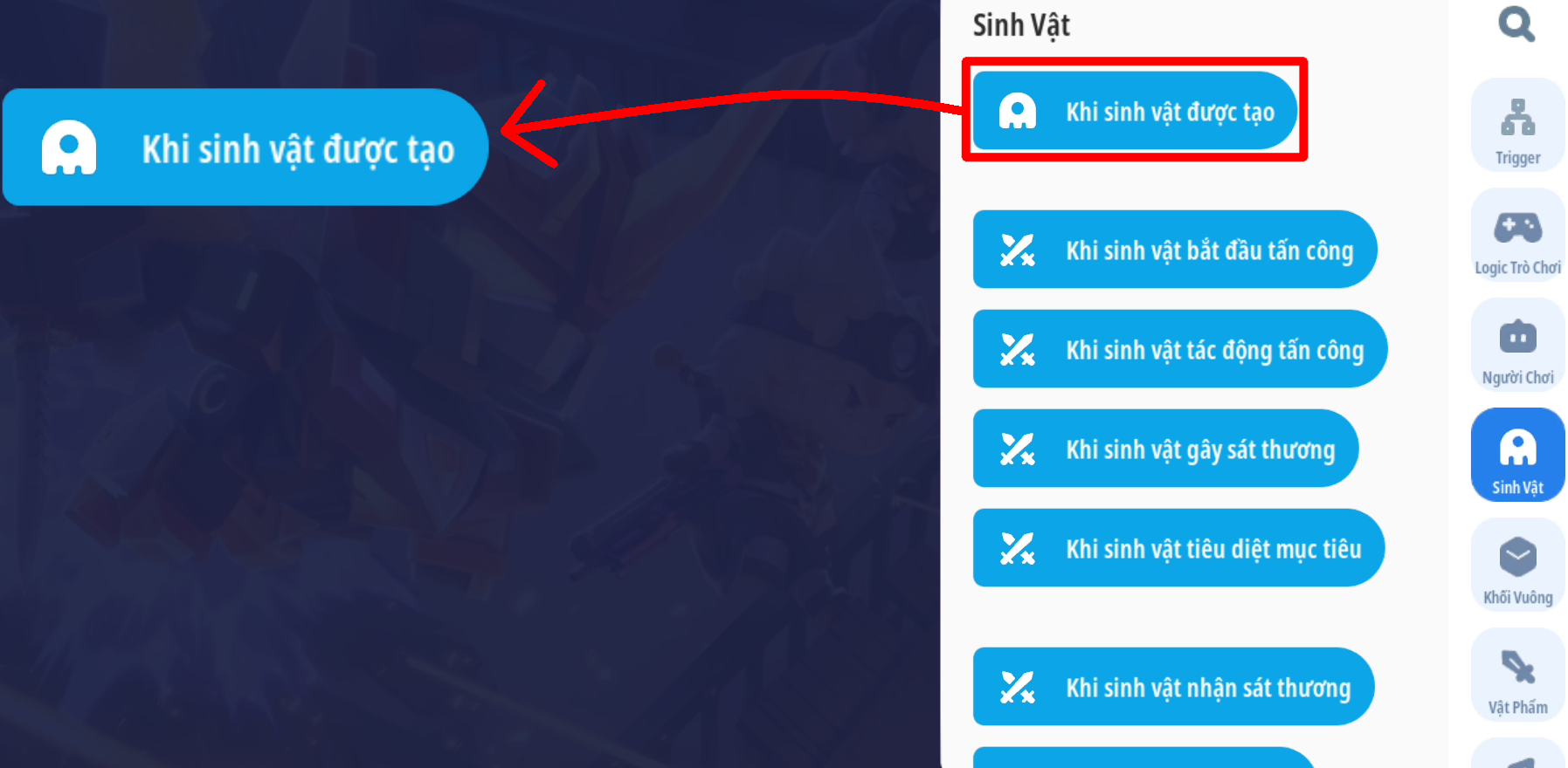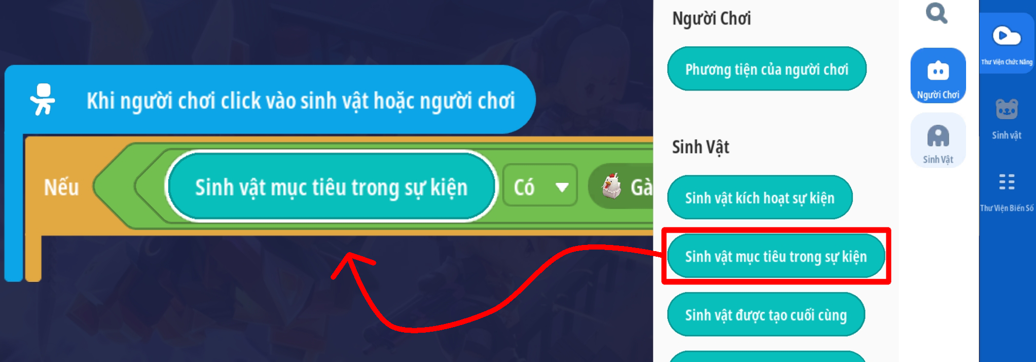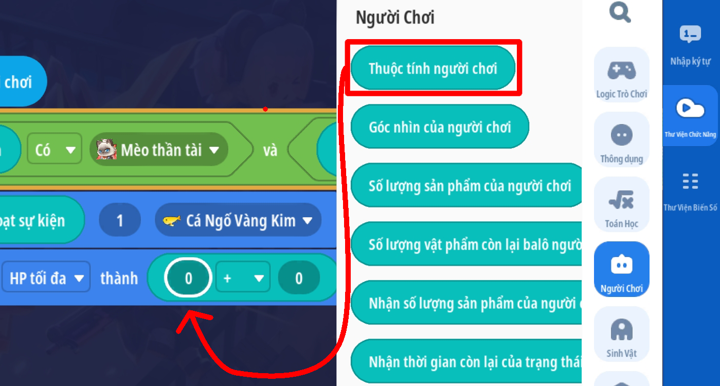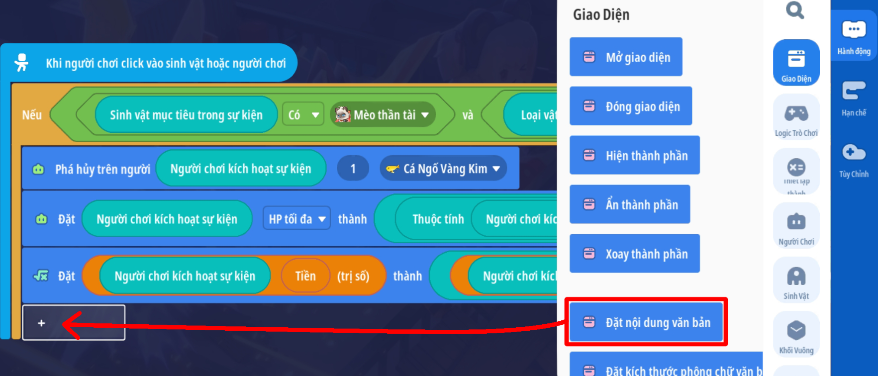 Tạo sự kiện người chơi nhấp vào sinh vật với điều kiện sinh vật mục tiêu trong sự kiện là “Mèo thần tài” và vật phẩm cầm tay của người chơi là Cá Ngố Vàng Kim ( Loại vậy phẩm thích hợp tùy bối cảnh)