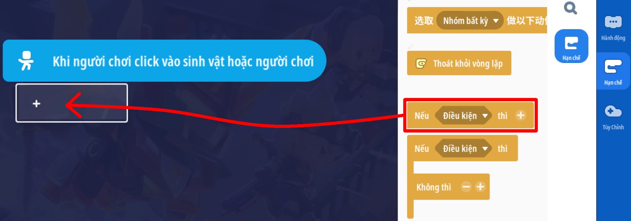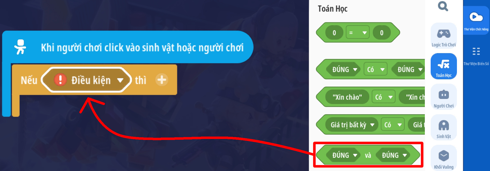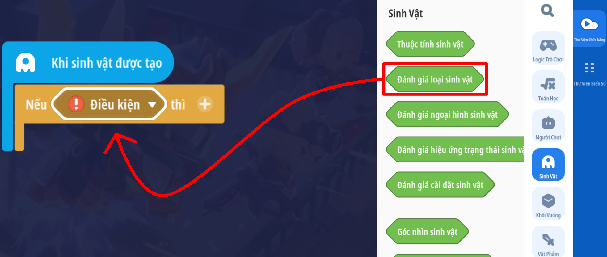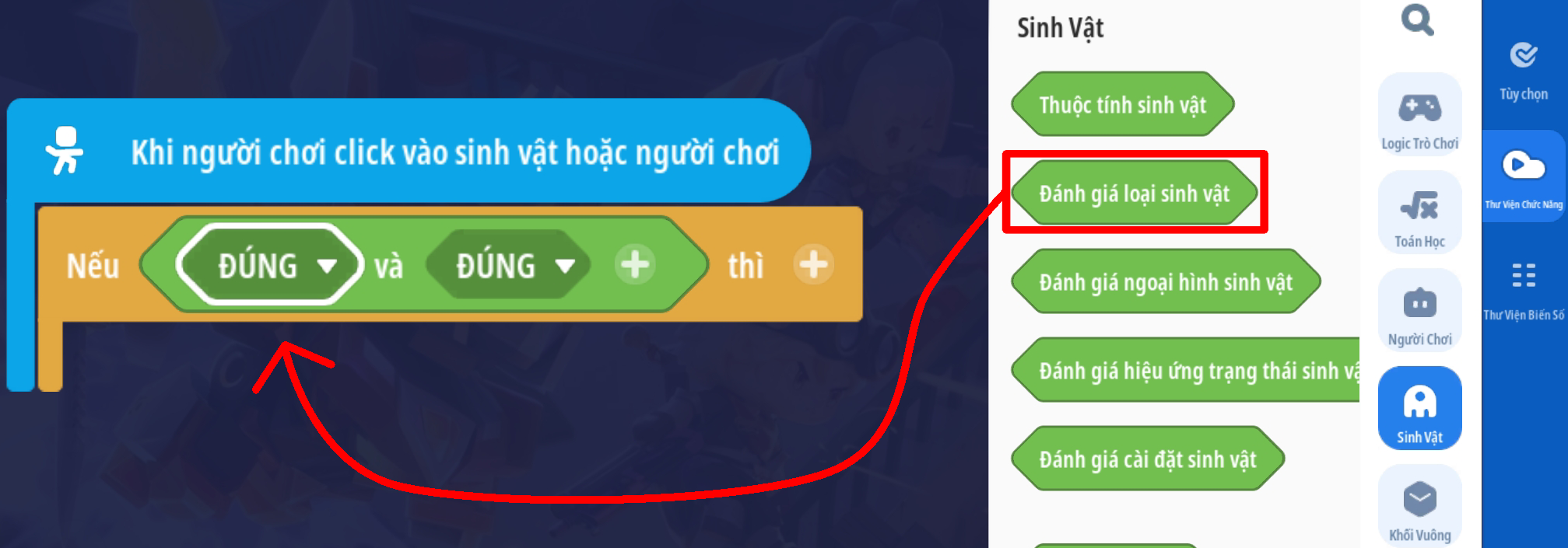 Tạo sự kiện người chơi nhấp vào sinh vật với điều kiện sinh vật mục tiêu trong sự kiện là “Mèo thần tài” và vật phẩm cầm tay của người chơi là Cá Ngố Vàng Kim ( Loại vậy phẩm thích hợp tùy bối cảnh)