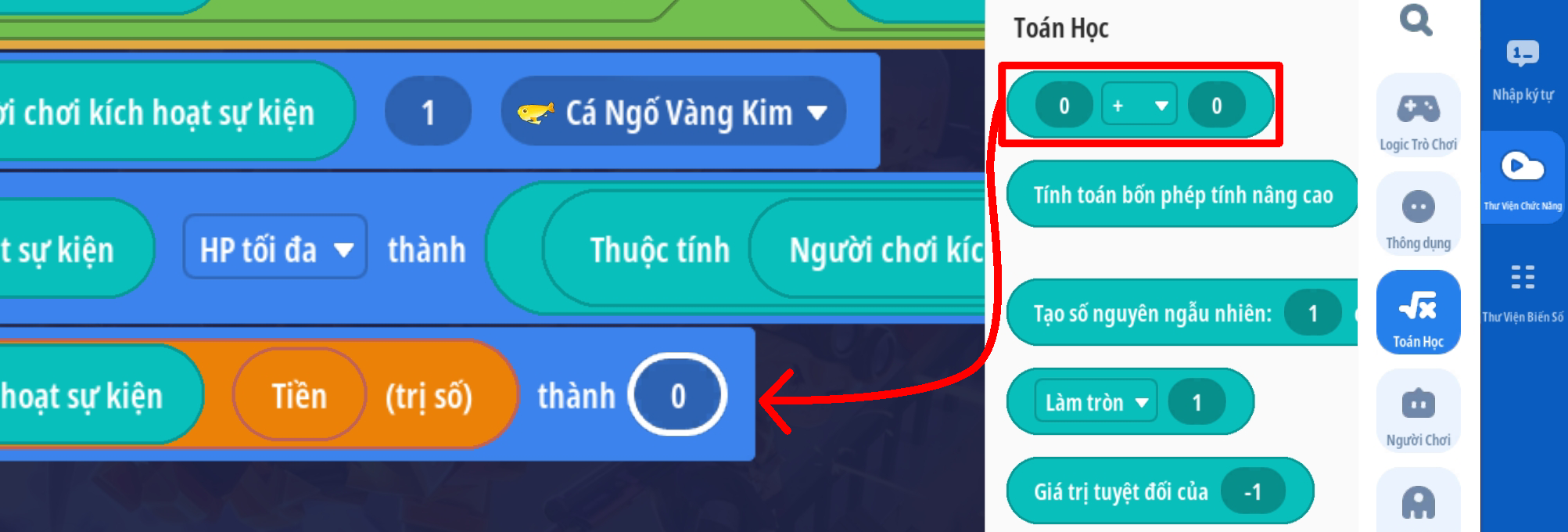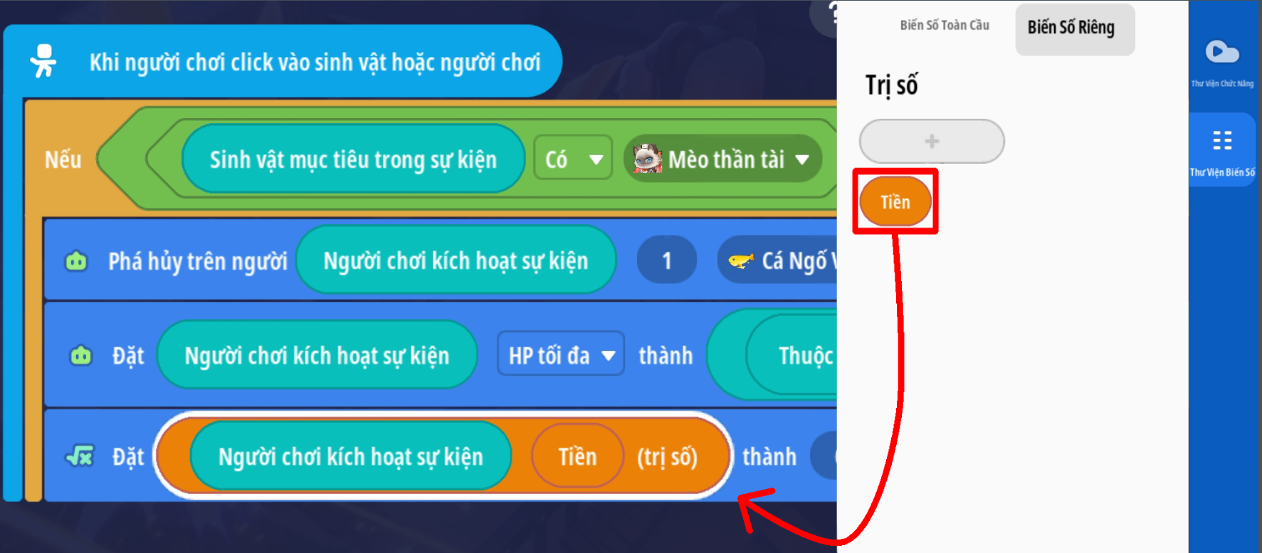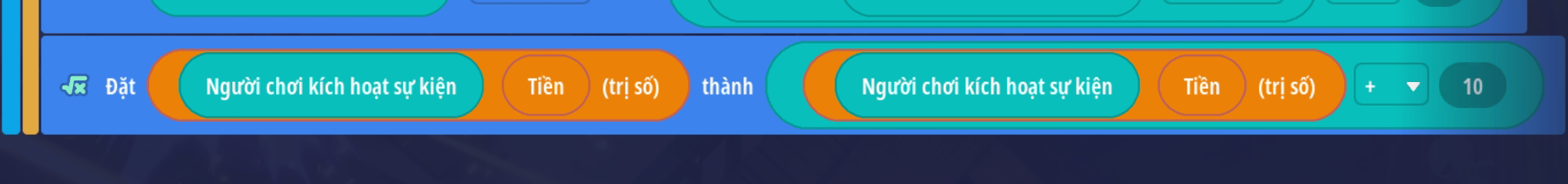 Thiết lập hành động thêm đặg giá trị biến số riêng Tiền thành giá trị: biến số riêng Tiền + 10 ( thiết lập phù hợp với cơ chế bản đồ đang làm )