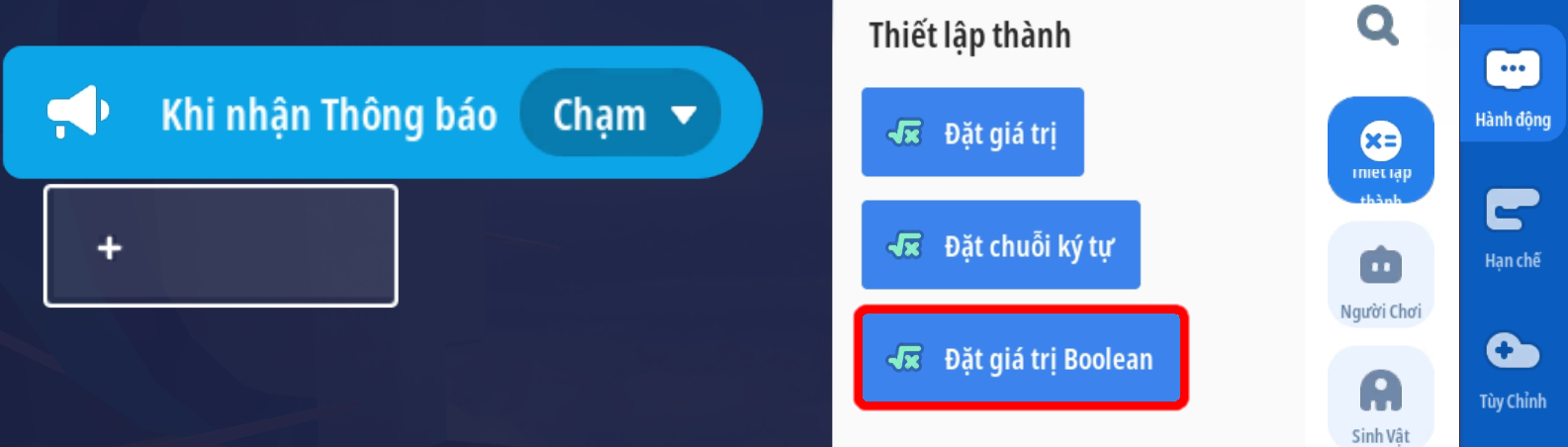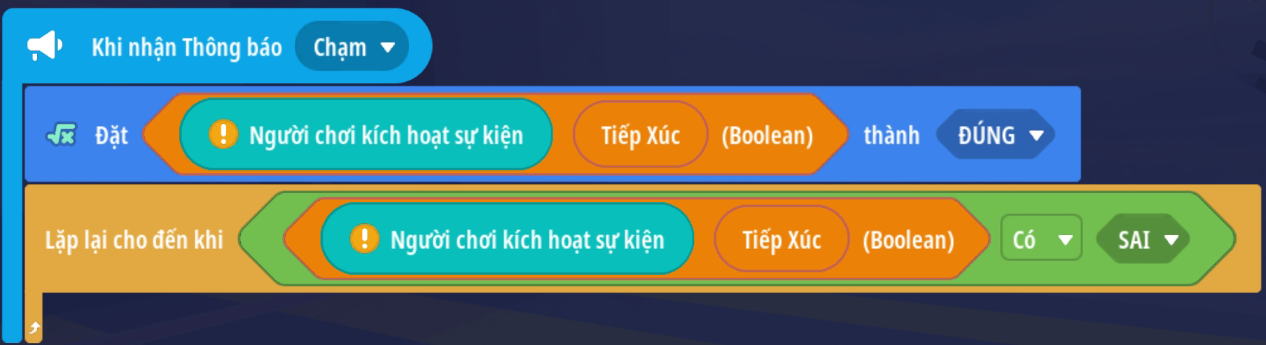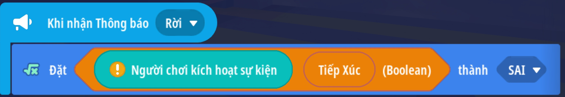 - Sự kiện kích hoạt khi nhận được phát sóng. Đặt giá trị Boolean xác định người chơi đang va chạm với tia laser
