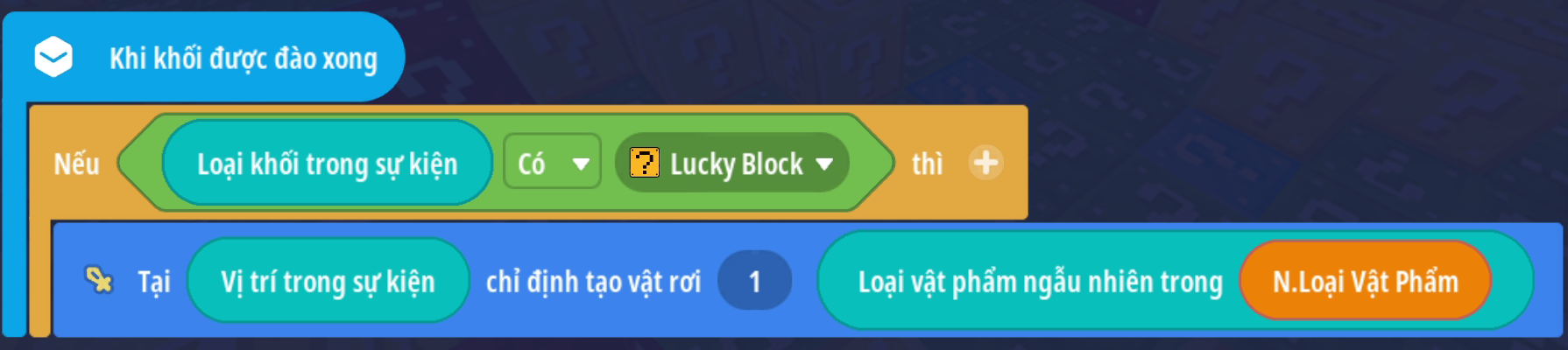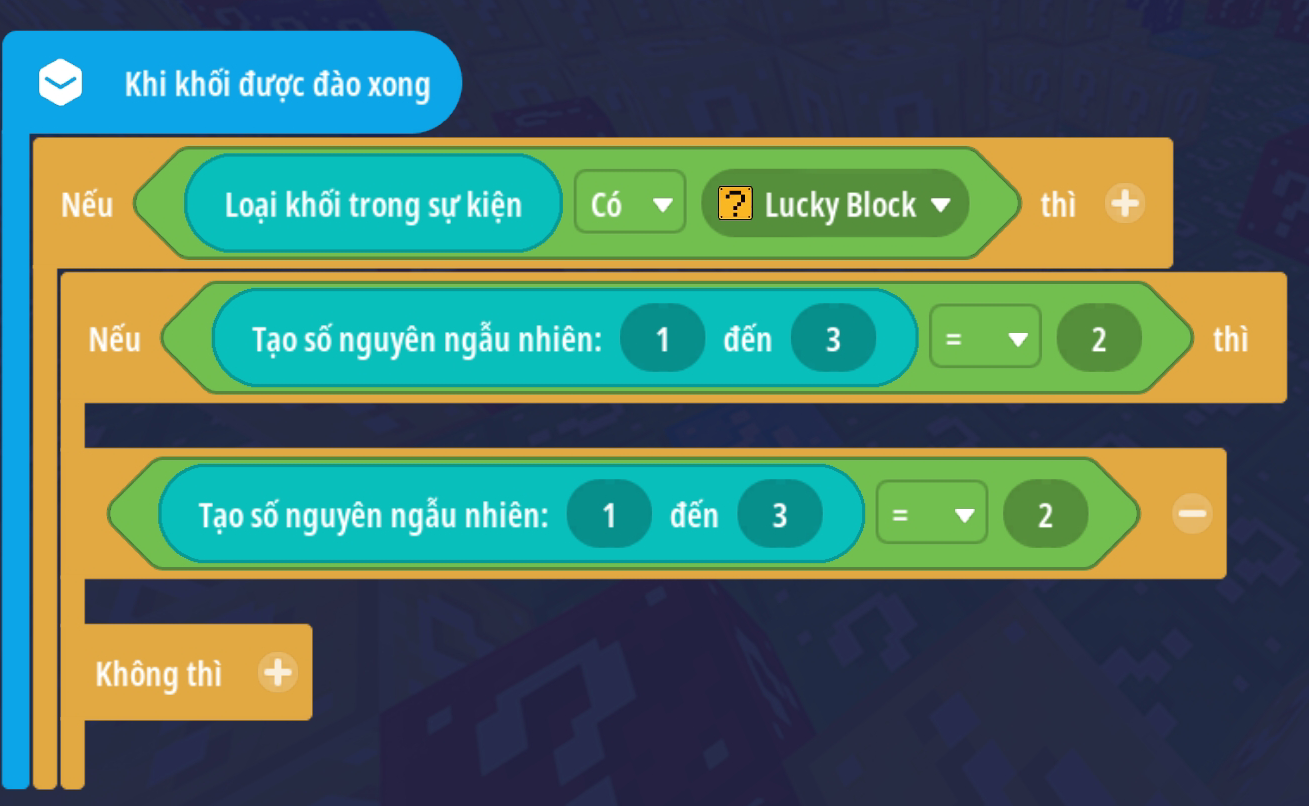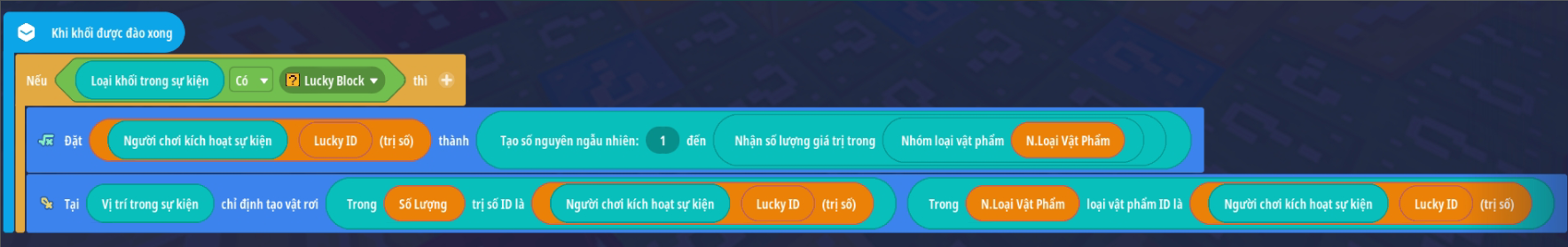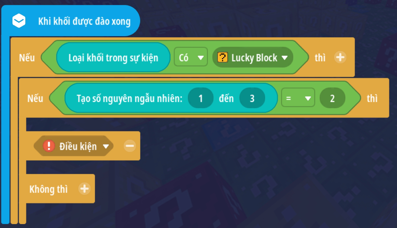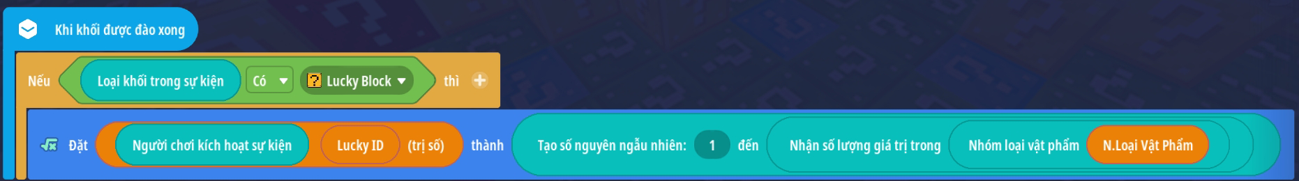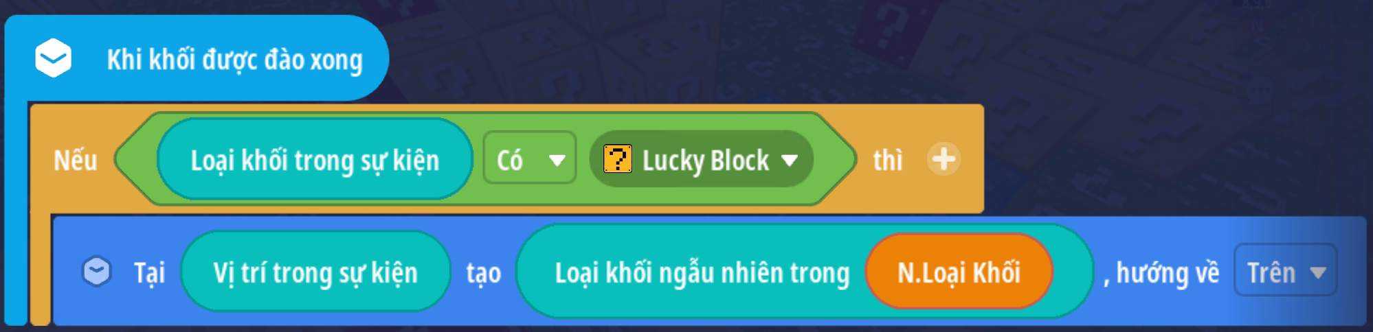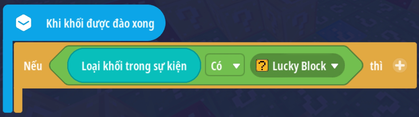 - Bước 3: Thêm điều kiện đánh giá khối vuông trong sự kiện là loại khối Lucky Block đã tạo