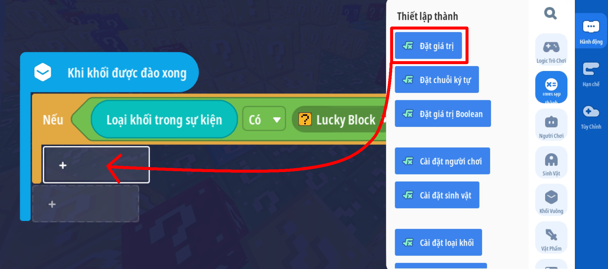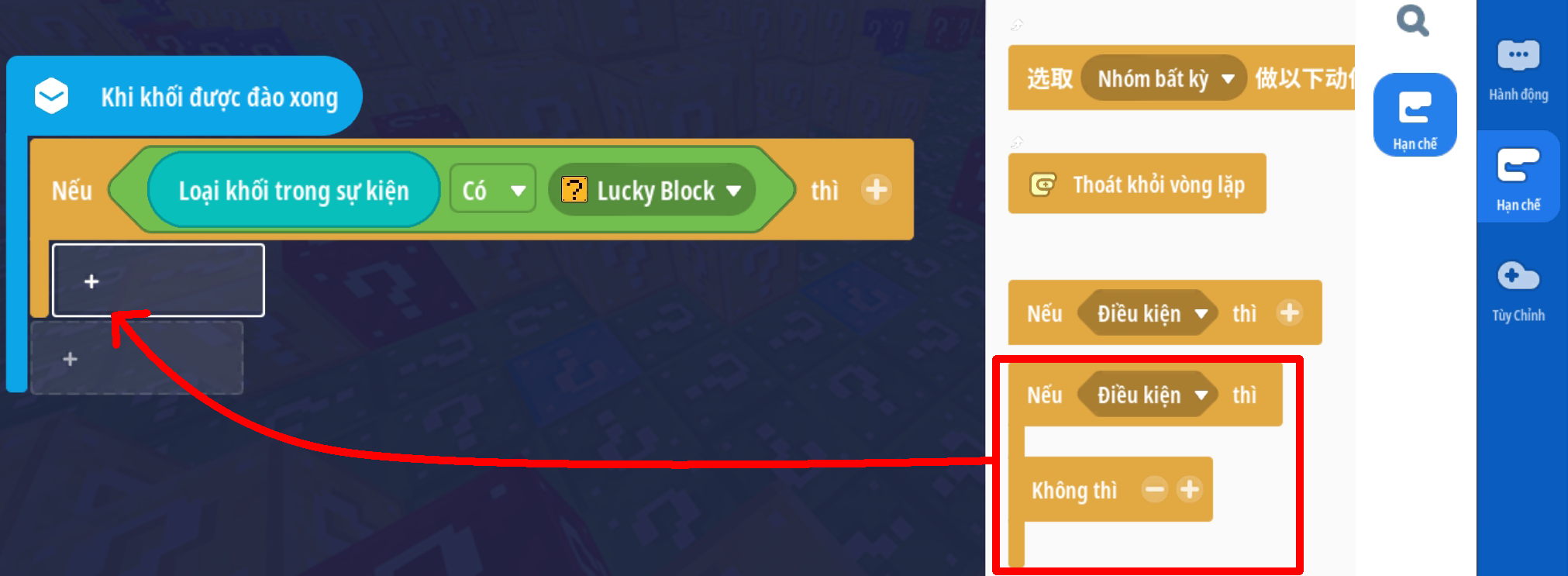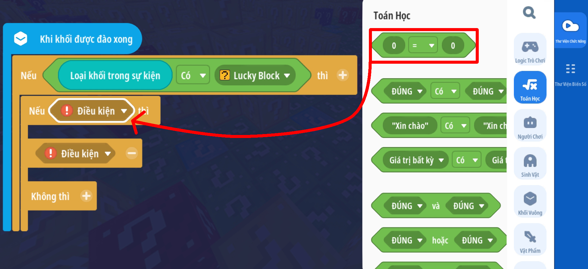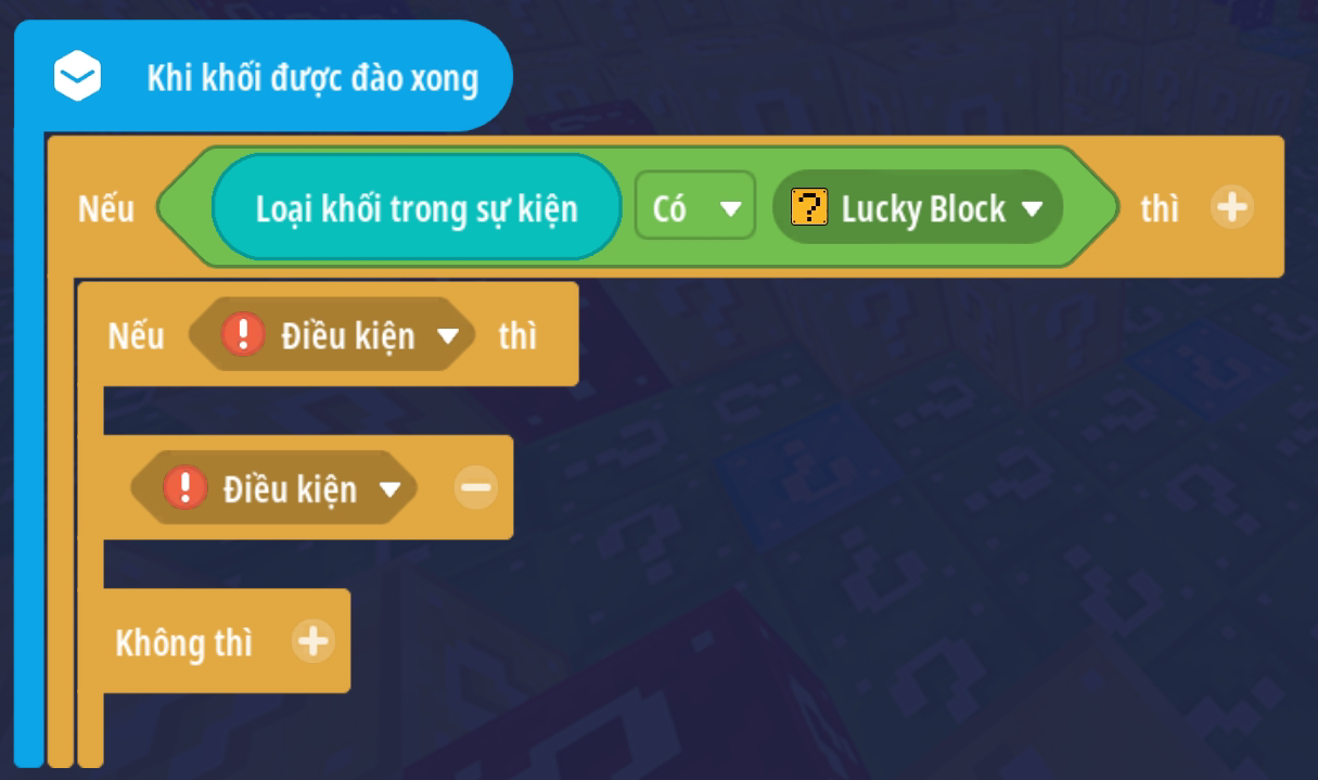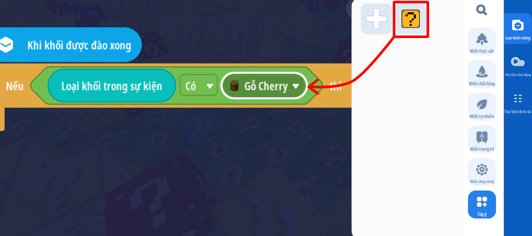 - Bước 3: Thêm điều kiện đánh giá khối vuông trong sự kiện là loại khối Lucky Block đã tạo