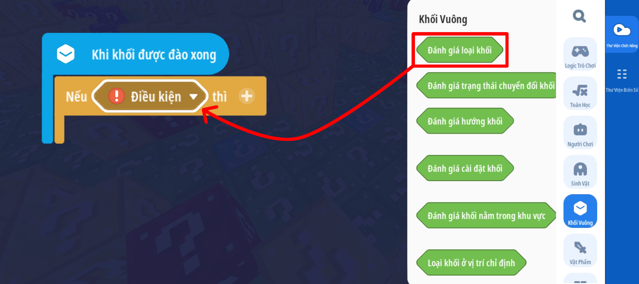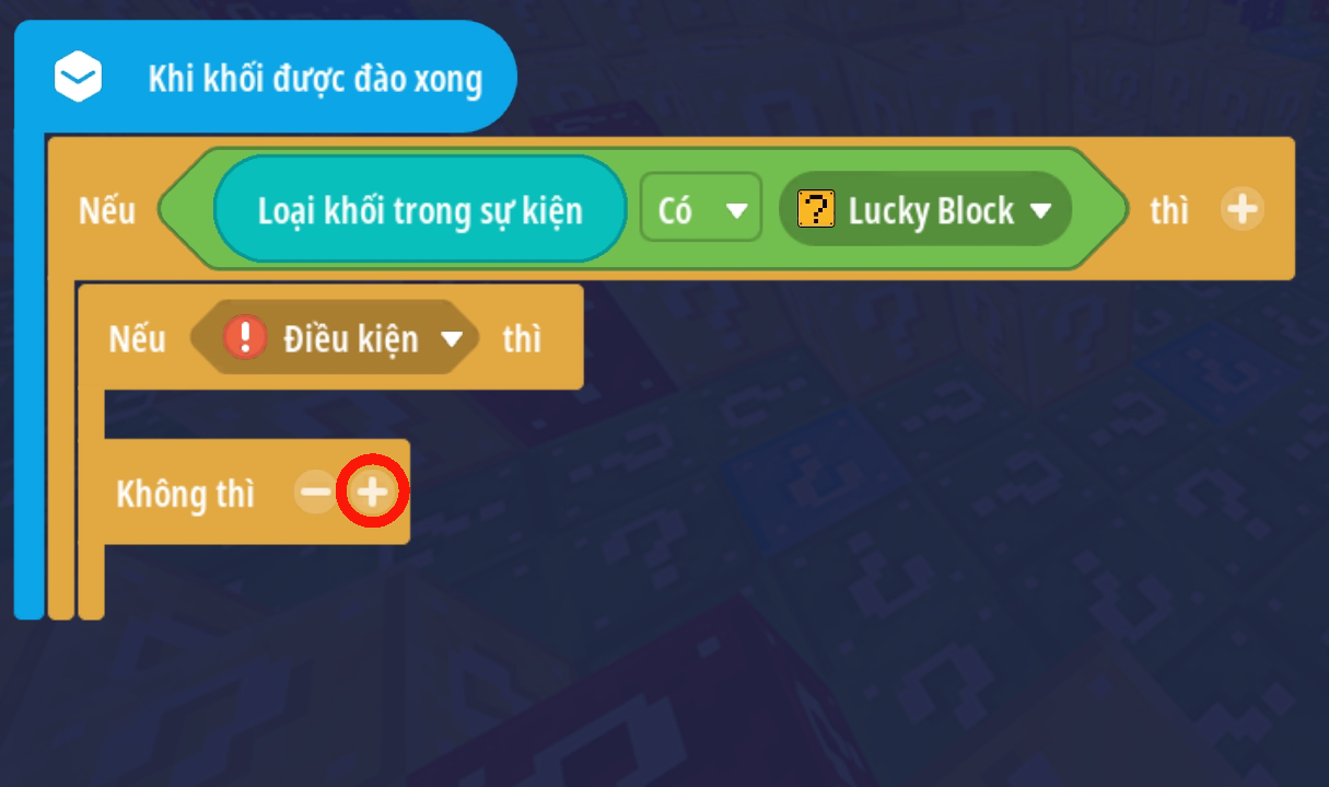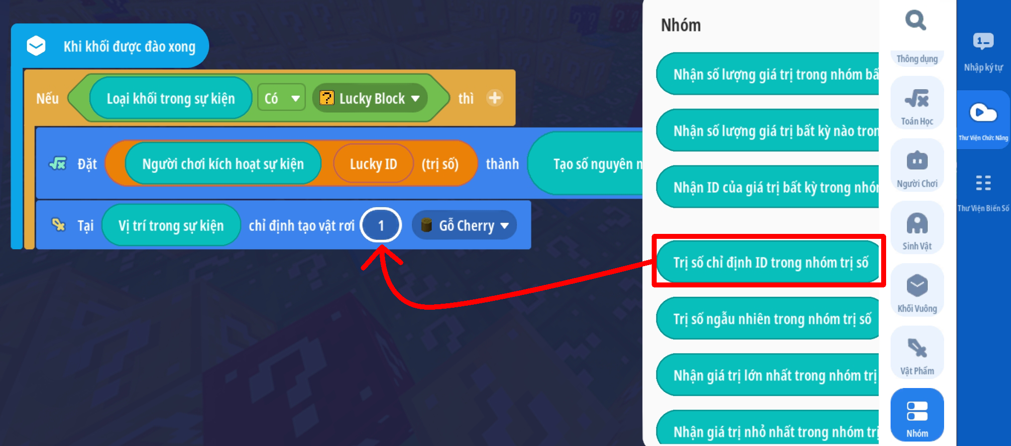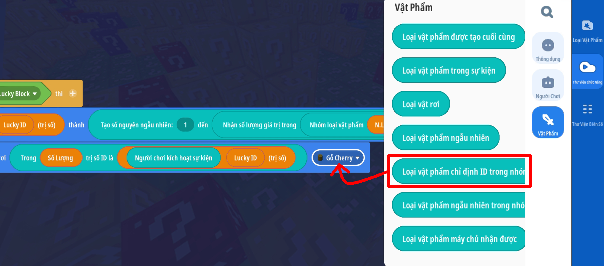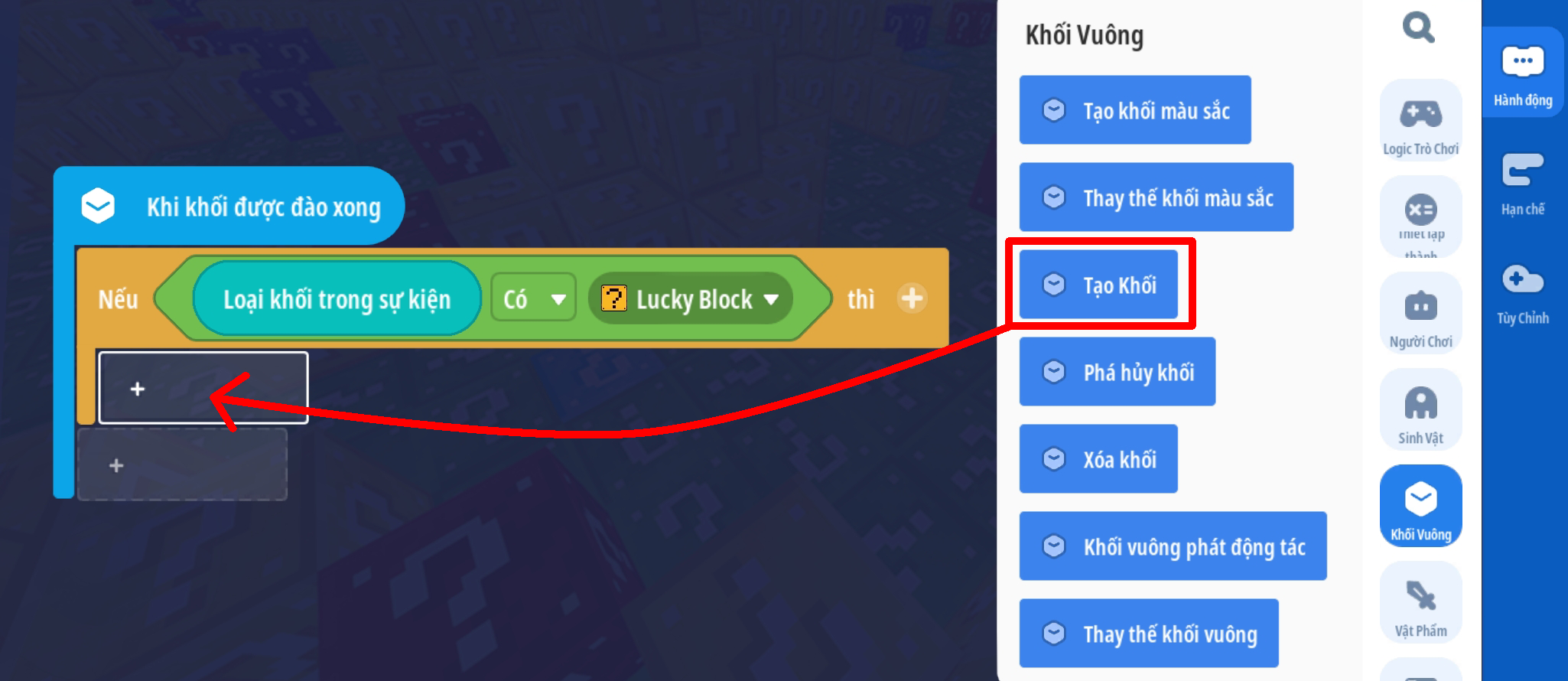 - Bước 3: Thêm điều kiện đánh giá khối vuông trong sự kiện là loại khối Lucky Block đã tạo